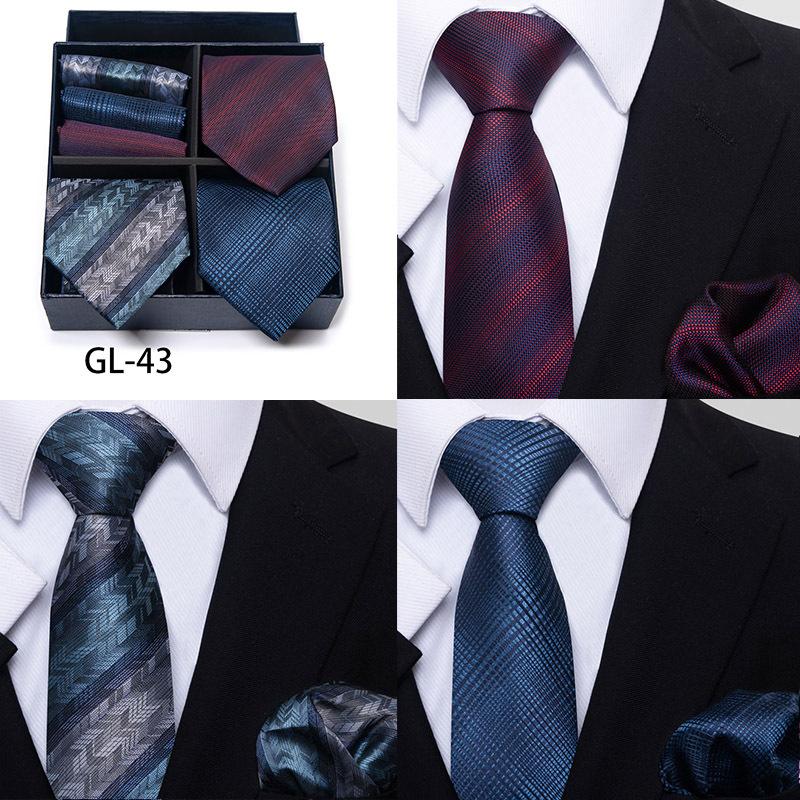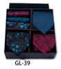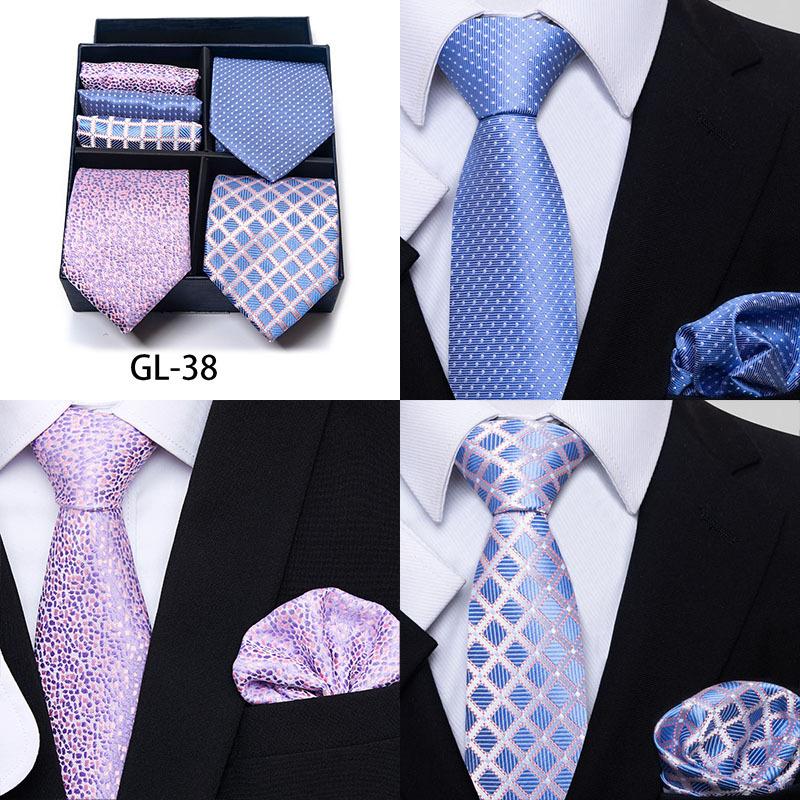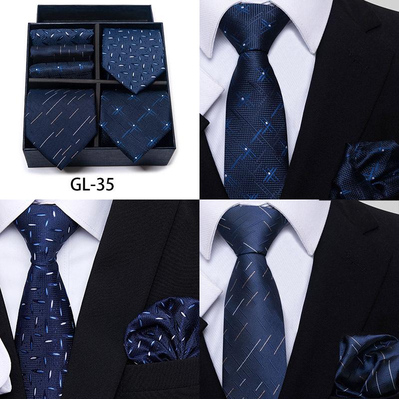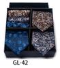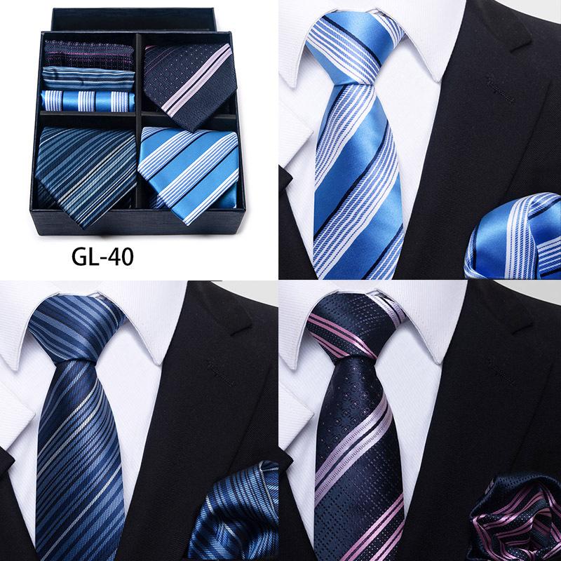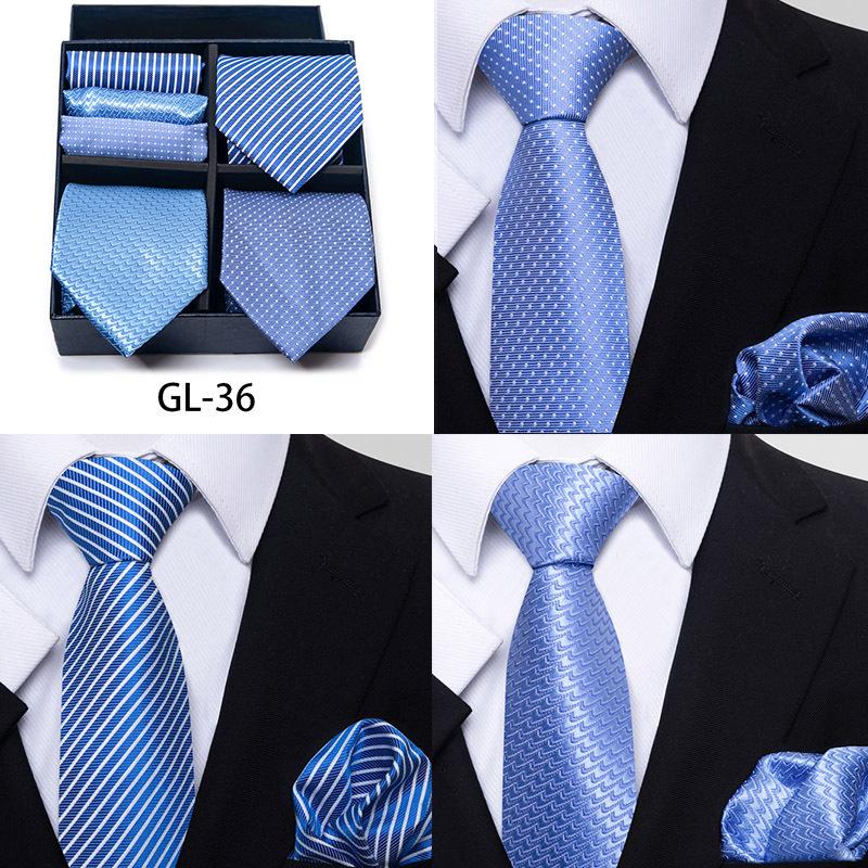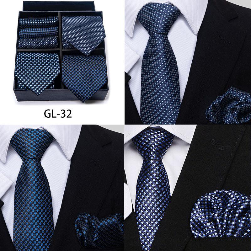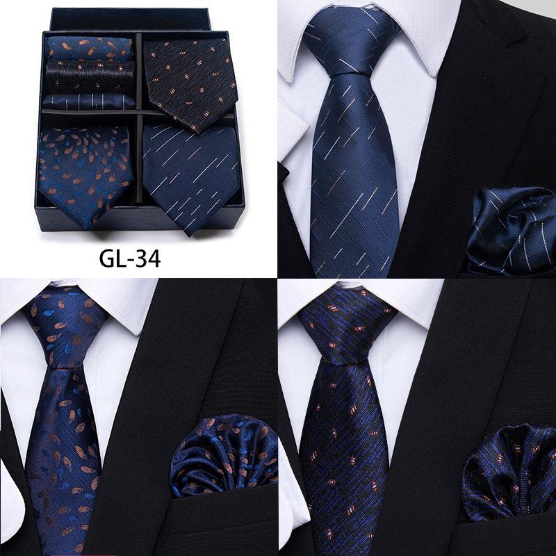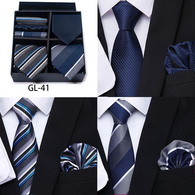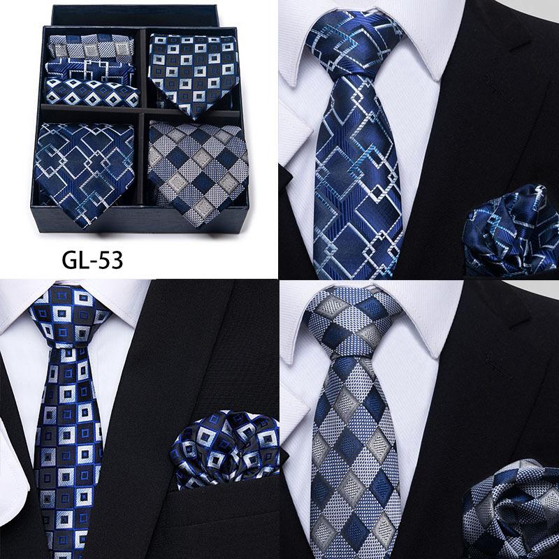 El juego incluye 3 corbatas, 3 bufandas y una caja de regalo azul de cuatro cuadrados.