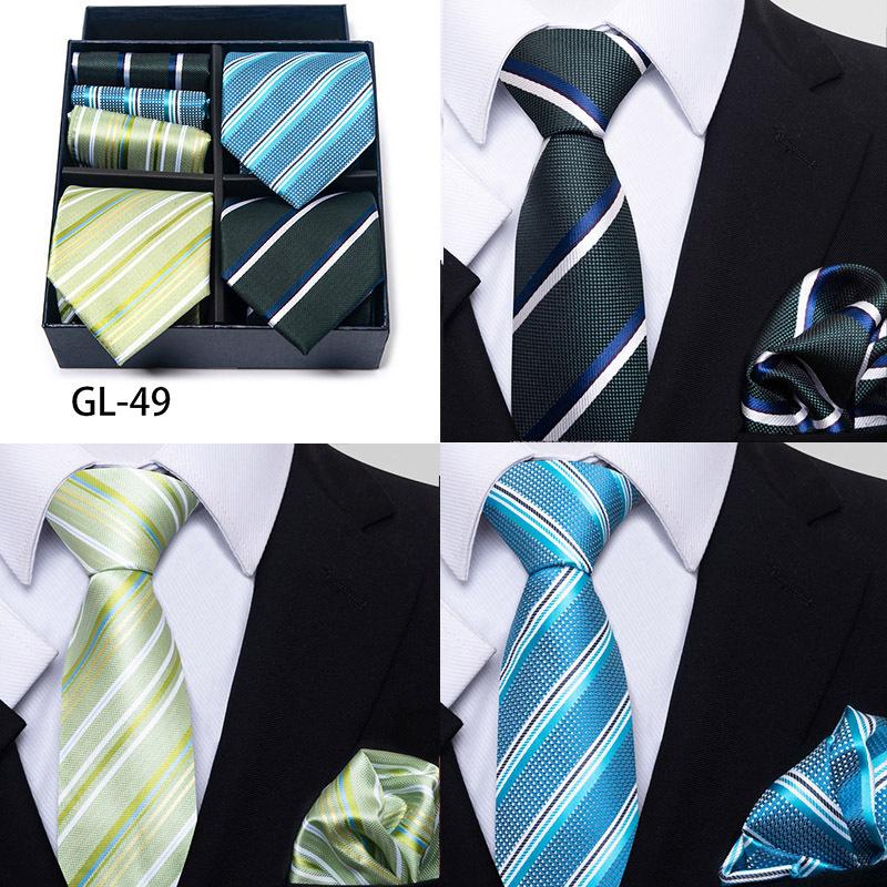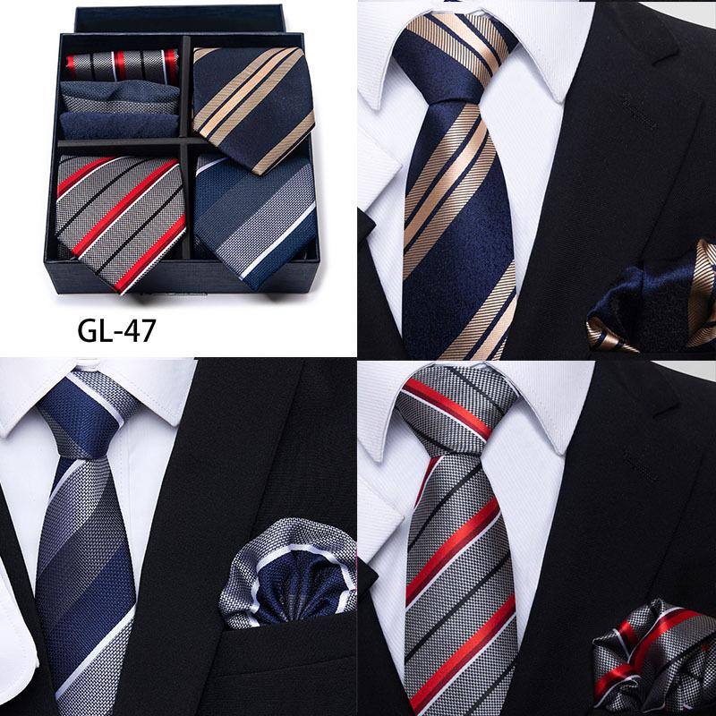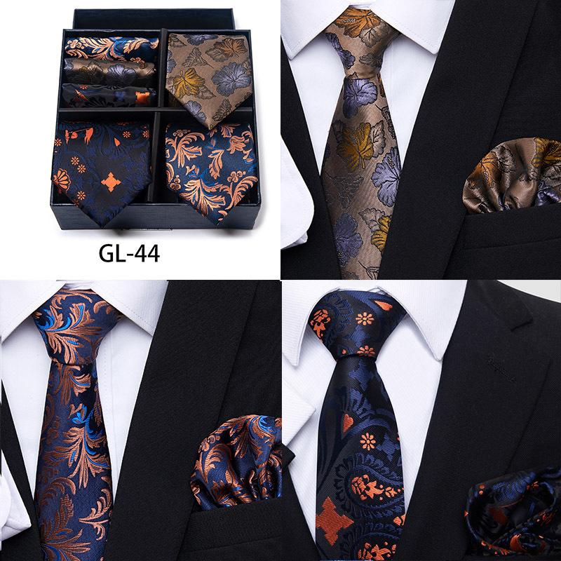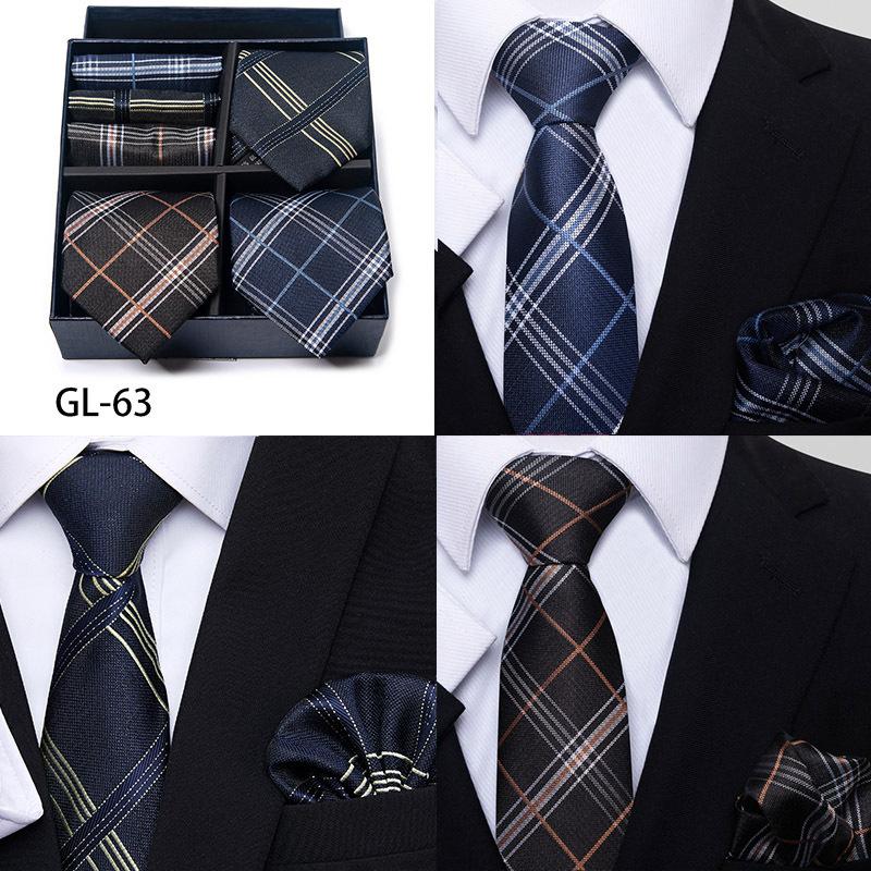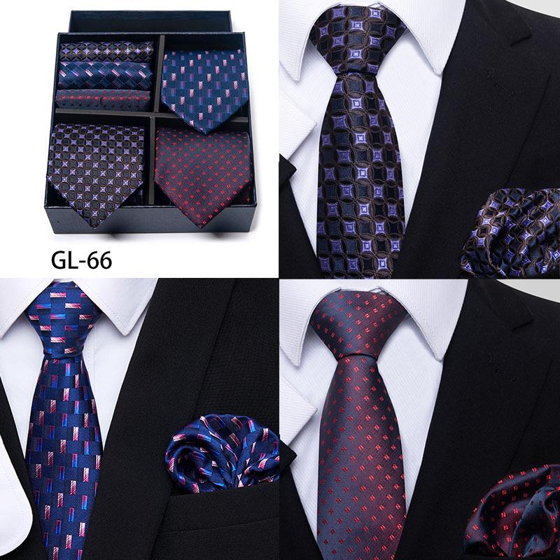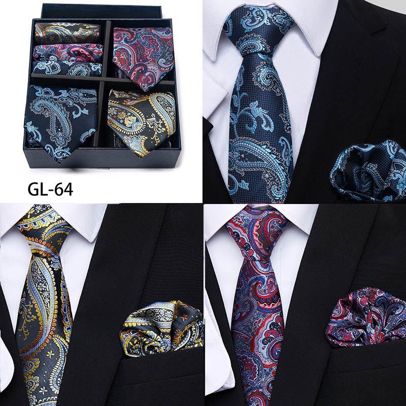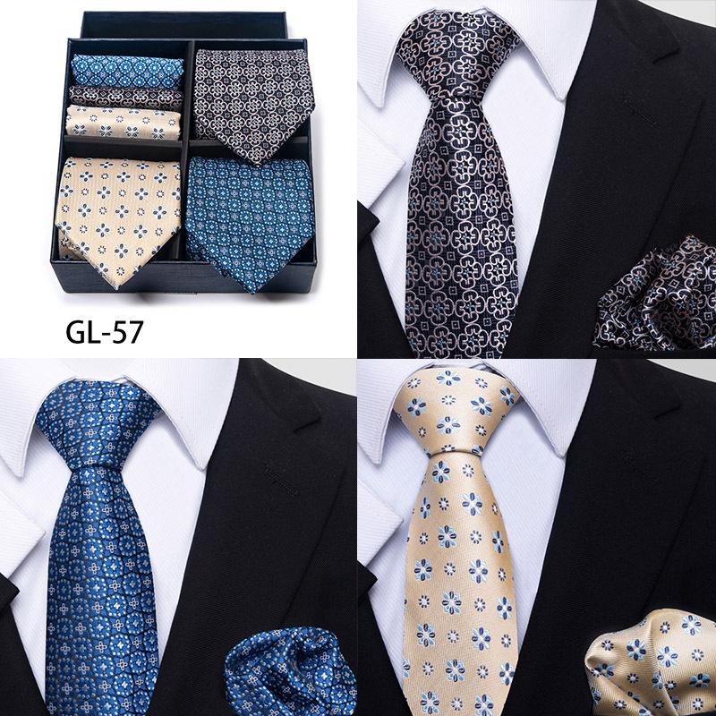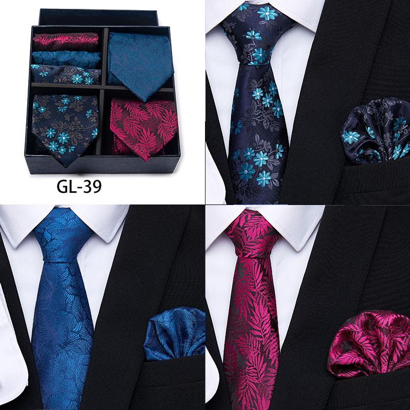El juego incluye 3 corbatas, 3 bufandas y una caja de regalo azul de cuatro cuadrados.