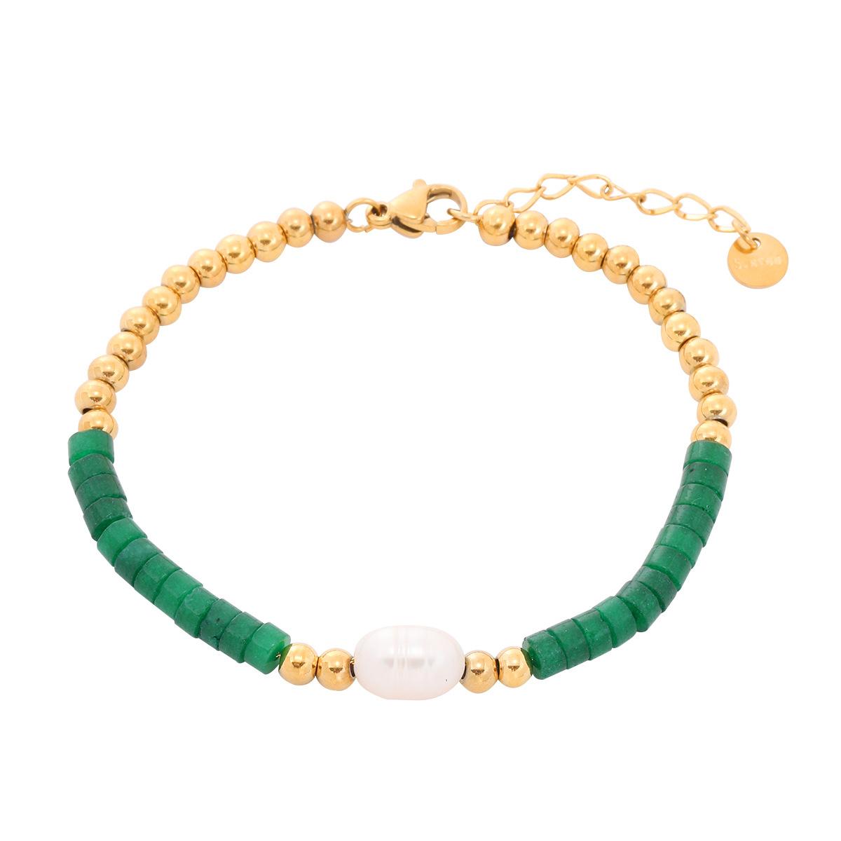 Pulsera europea y americana transfronteriza de nueva piedra natural verde perla acero titanio pulsera bohemia hecha a mano con cuentas de acero inoxidable