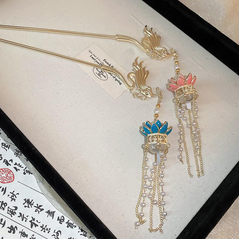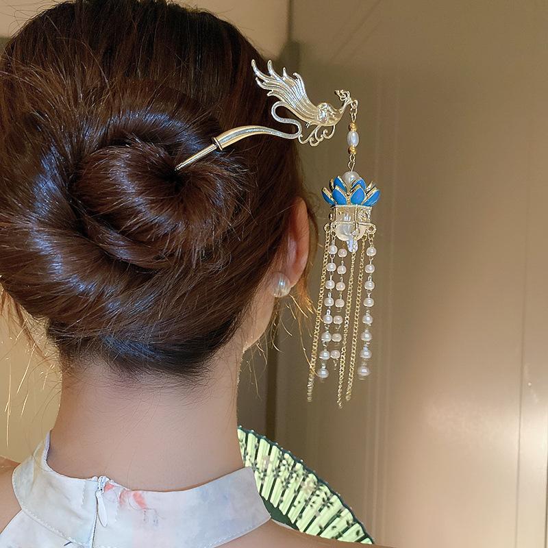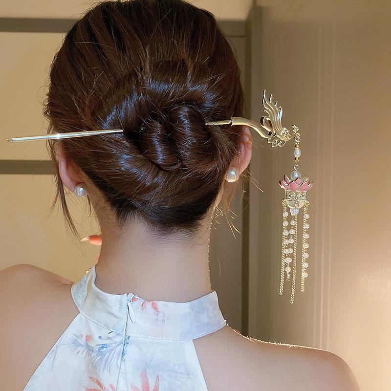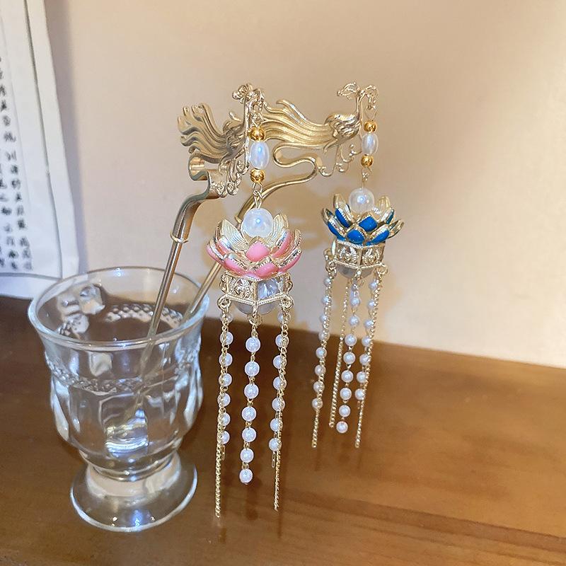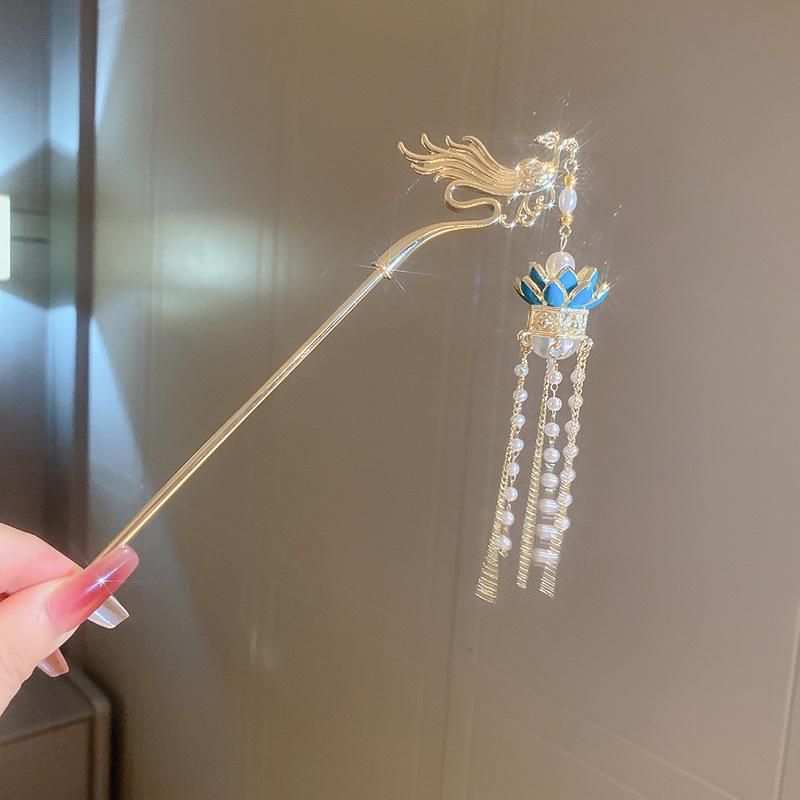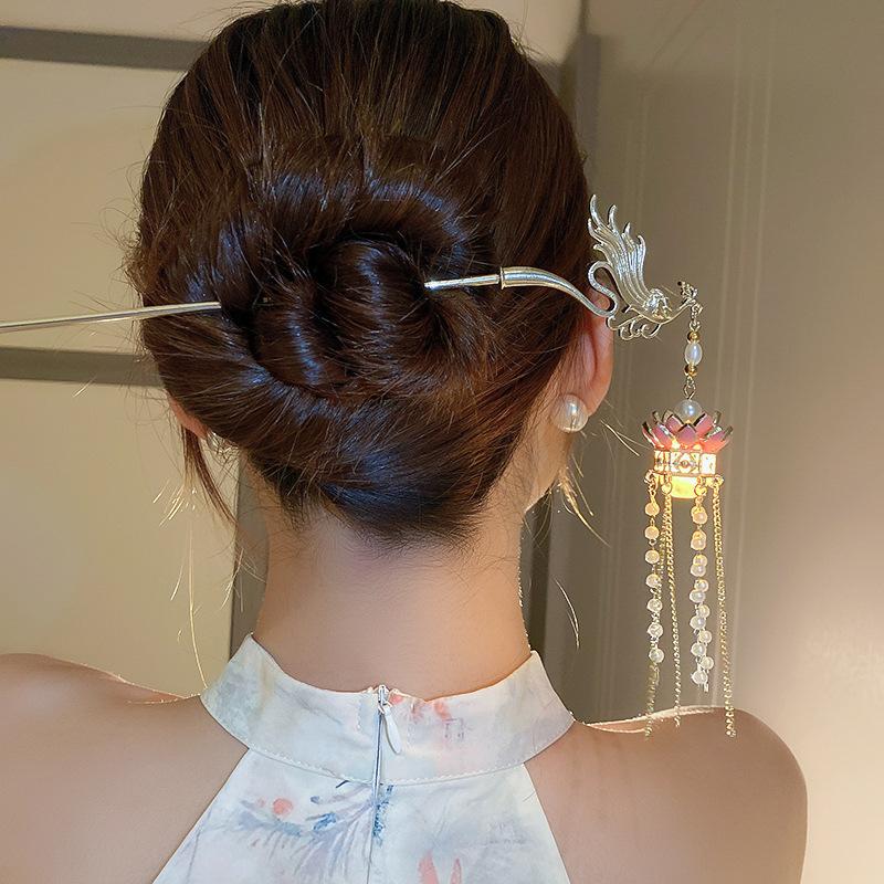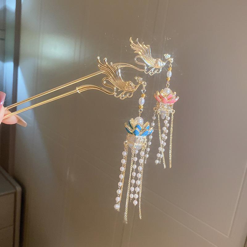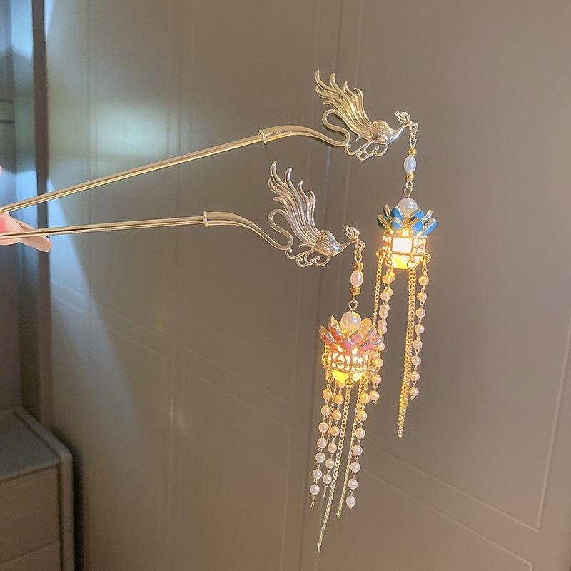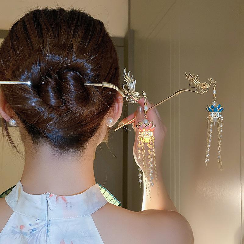 Nueva Horquilla China Luminosa Fénix Loto Perla Borla Estilo Nacional Hanfu Placa Avanzada Paso a Paso Cabello Horquilla Accesorios para el Cabello para Mujer