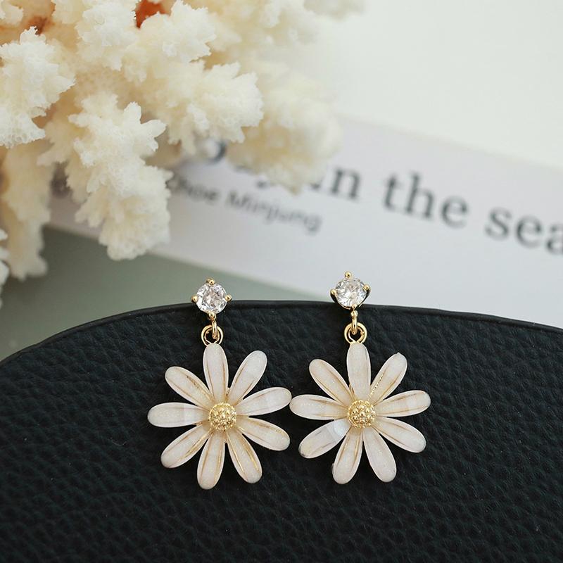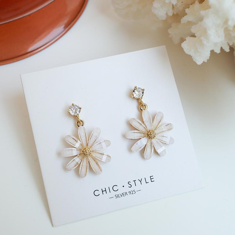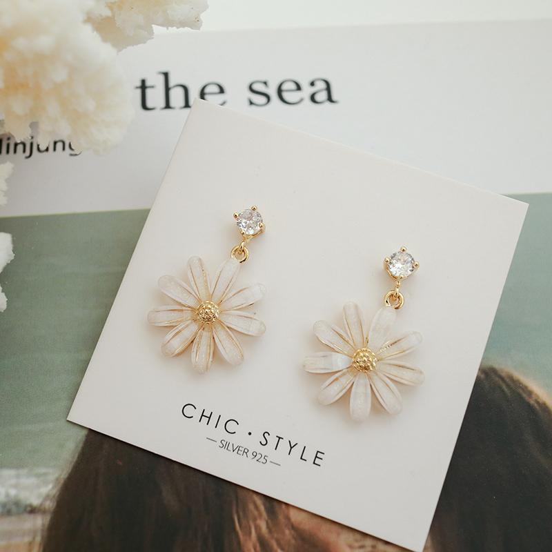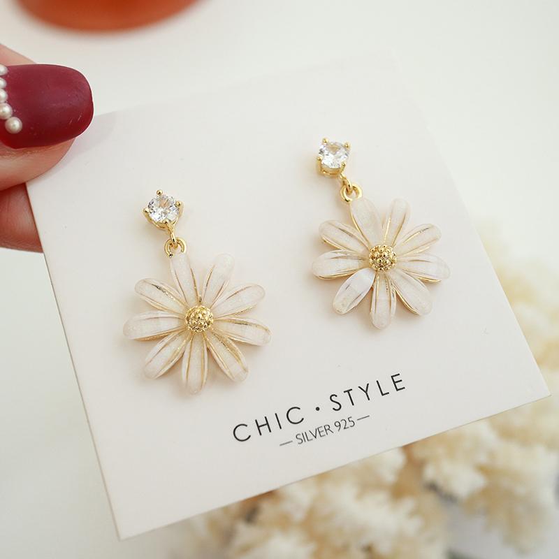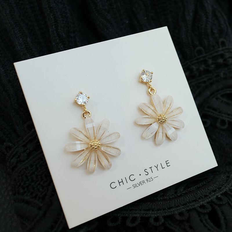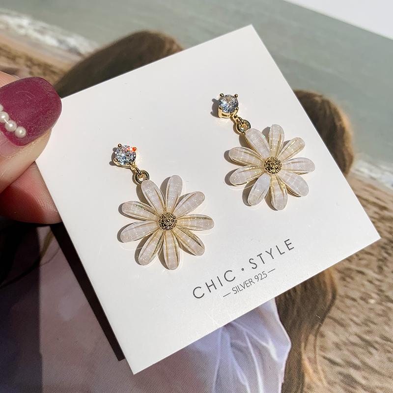 Pendientes coreanos nuevos de plata S925 con forma de flor de sol y margaritas pequeñas con aguja, pendientes coreanos sencillos con diamantes de cristal, pendientes súper llamativos