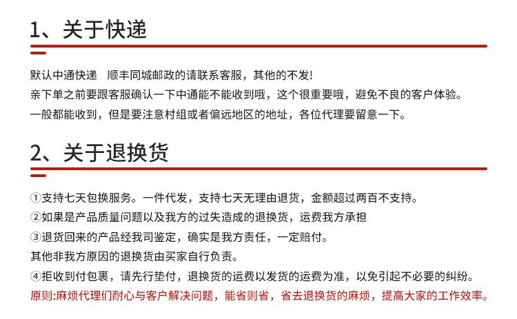 03Logística exprés:Nuestros servicios de mensajería predeterminados son Zhongtong y Yunda. Si necesita otros servicios de mensajería, póngase en contacto con el servicio de atención al cliente en línea. Si el servicio de mensajería no puede realizar la entrega o necesita la mercancía con urgencia, póngase en contacto con el servicio de atención al cliente para cambiar a Shunfeng y Postal Express. Para envíos a granel por logística, indique al servicio de atención al cliente la dirección de la empresa de logística más cercana y el nombre de la estación de envío. Así podrá recoger la mercancía lo antes posible y en el punto más cercano. Declaramos solemnemente que no podemos controlar el servicio de mensajería ni la logística. Por favor, no utilice su insatisfacción con la actitud del servicio de mensajería y logística ni con el tiempo de entrega como motivo para evaluarnos.