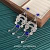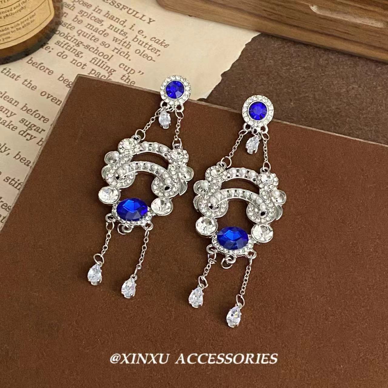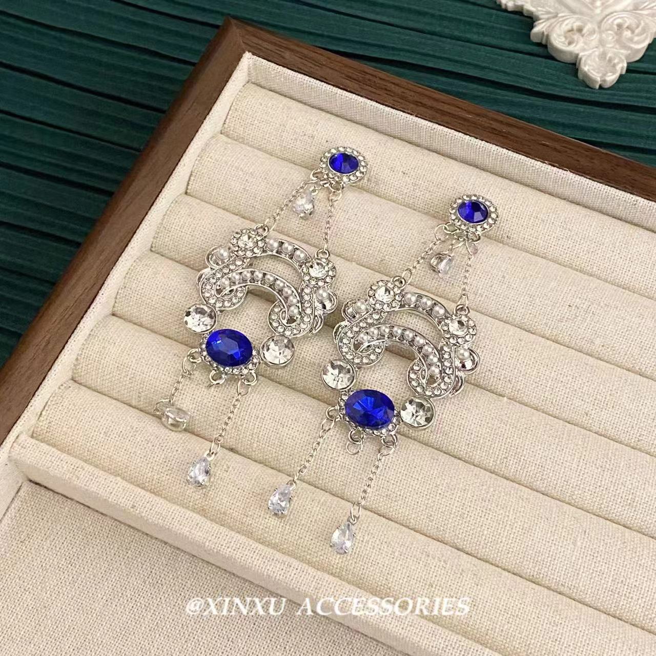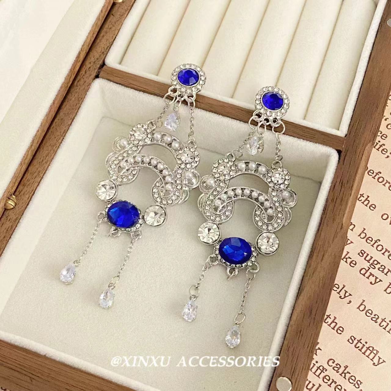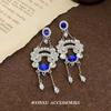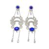 Nuevos pendientes de diamantes de imitación azules estilo retro exagerado europeo y americano para mujer, pendientes largos con borlas, elegantes y de alta gama.