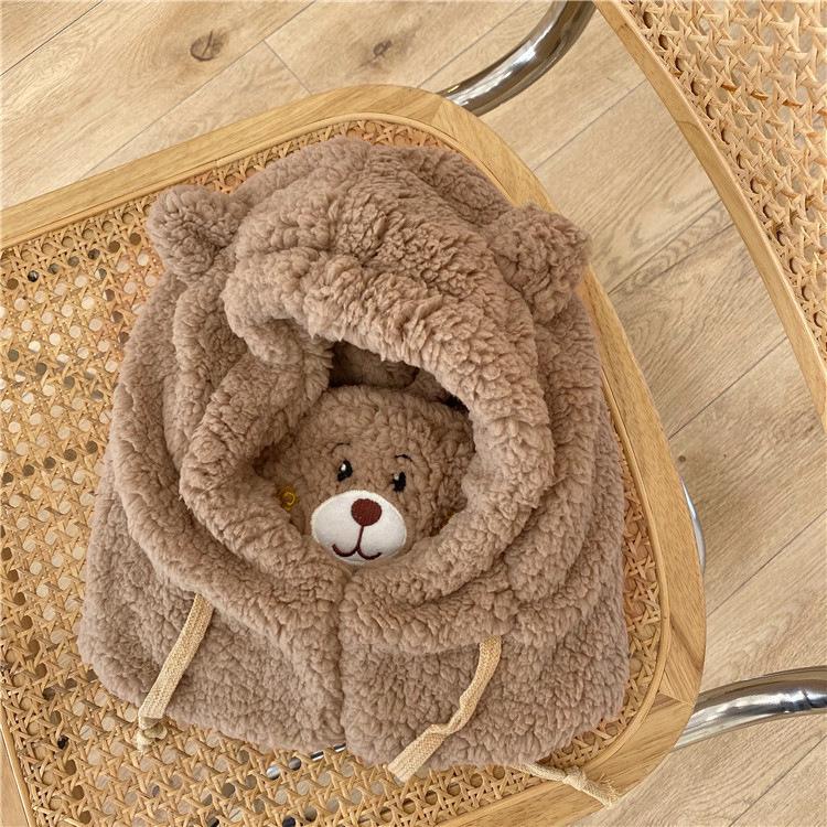 Gorro con bufanda de oso, cálido y versátil, para mujer, de invierno, de lana de cordero, estilo coreano, con capucha y esponjoso.