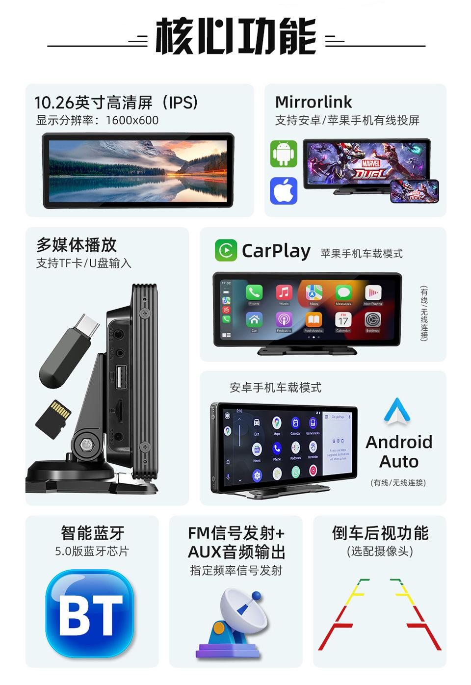 Función:Proyección de pantalla: Soporta Carplay inalámbrico, AndroidAuto inalámbrico, AndroidAuto por cable