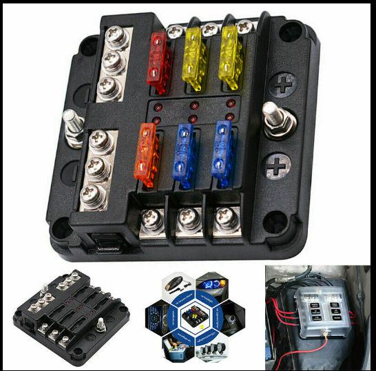Caja de fusibles para automóvil y barco de 6 vías con polo positivo y negativo, enchufable, multisalida con luz LED, modificación de caja de fusibles, barra colectora