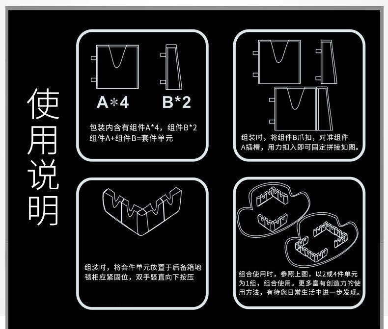 Nota: Los accesorios incluyen 4 piezas de velcro adhesivo, y el tapete de cuero para cajuela también se puede instalar pegándolo.