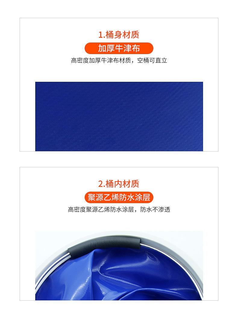 [Material del producto]: El barril está hecho de tela Oxford con revestimiento de plástico (polietileno), material de tela sintética impermeable. Asa: acero 45#; Anillo blanco: hecho de material plástico nuevo (PP)