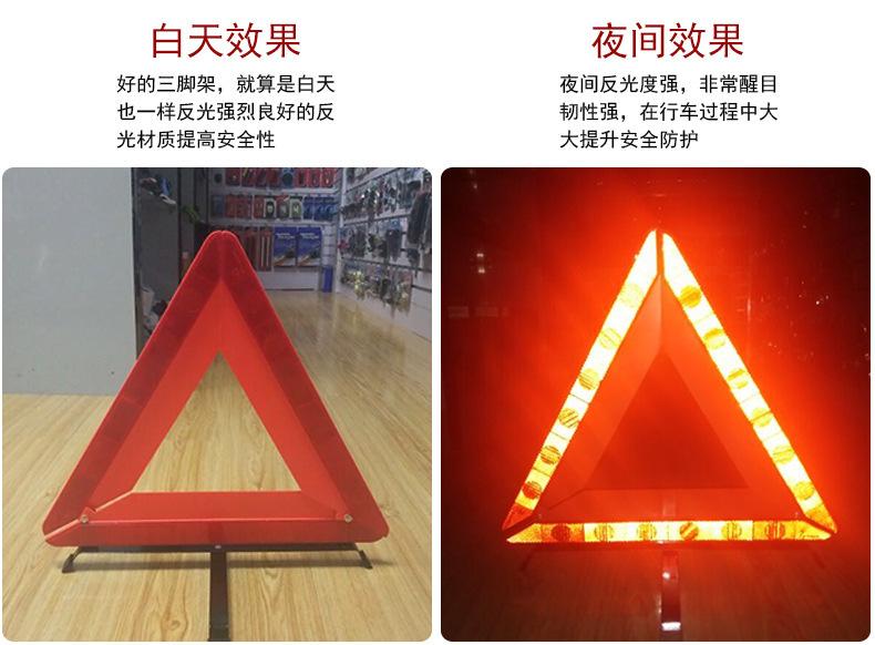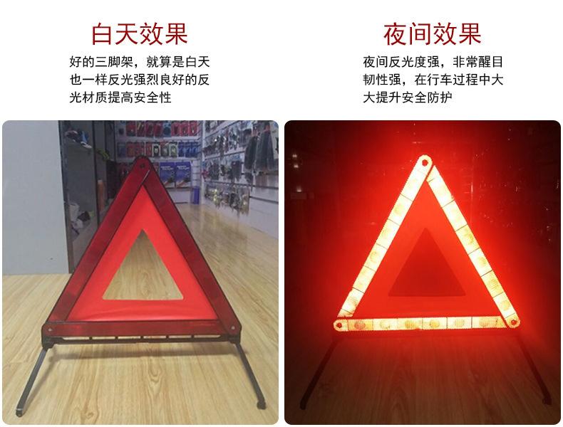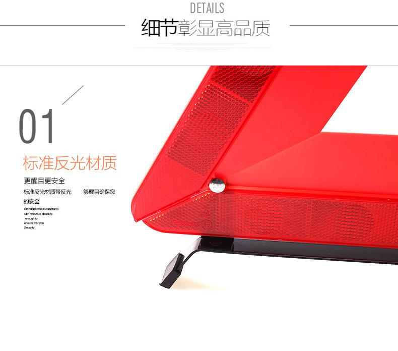 Triángulo de coche: El llamado triángulo de coche puede ser un elemento con tres lados rojos que brilla de noche. ¡Es una señal de advertencia! Si el coche se avería en la carretera, coloque la señal de advertencia detrás del vehículo, a más de 20 metros de distancia. Sirve para recordar al conductor que hay un coche aparcado delante y que debe reducir la velocidad y adelantar con cuidado. Una señal de advertencia triangular cualificada tiene un triángulo reflectante en el exterior y un triángulo fluorescente en el centro. El triángulo reflectante exterior sirve para que las luces del coche reflejen una luz muy intensa al conductor por la noche. El triángulo fluorescente central es de reflexión difusa, lo que permite al conductor ver con mayor claridad durante el día.