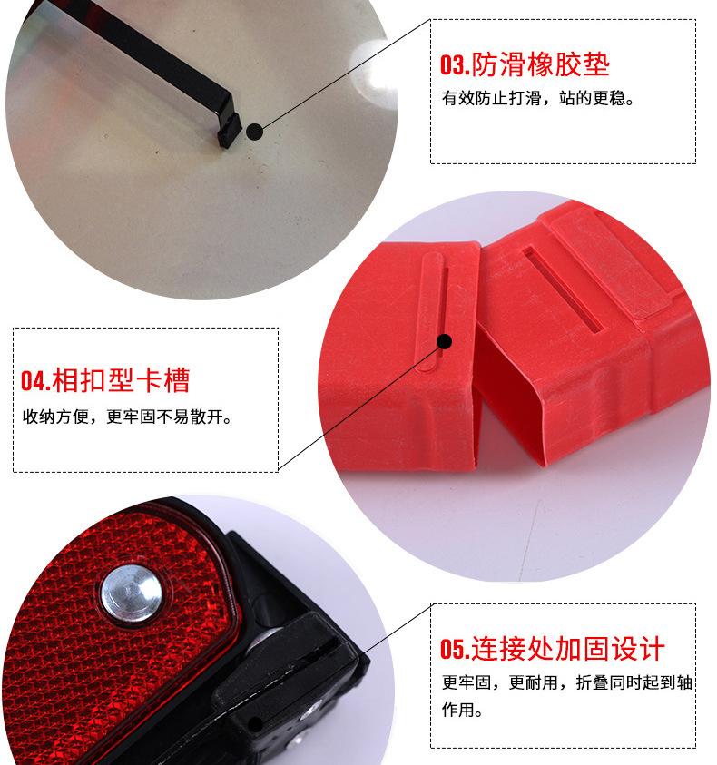 3. Al finalizar el uso, retraiga las láminas reflectantes izquierda y derecha y los pies de apoyo en orden inverso al de la apertura anterior y colóquelos en la caja de embalaje. Al retirar la señal, preste atención a proteger las superficies reflectantes roja y fluorescente para evitar rayones. Al conectar y desconectar las láminas reflectantes izquierda y derecha, empújelas o tire de ellas en la dirección de la ranura para evitar dañar la señal.