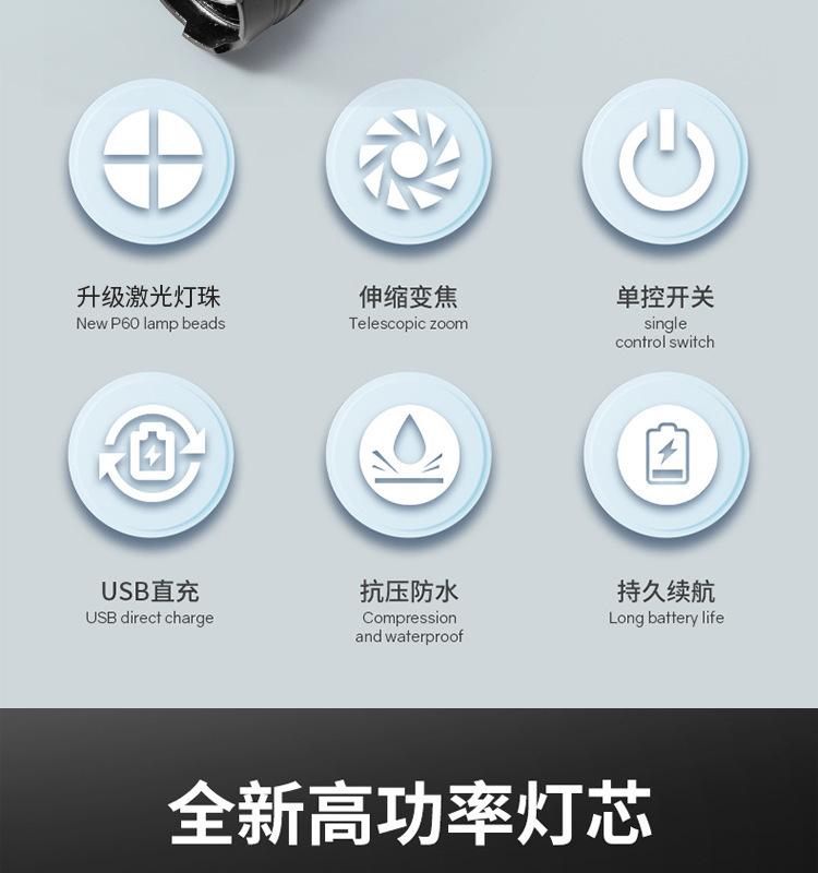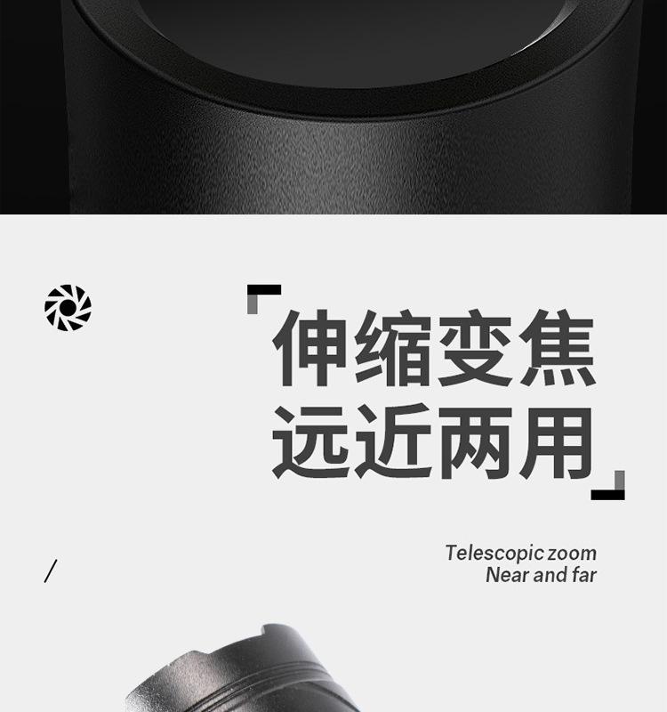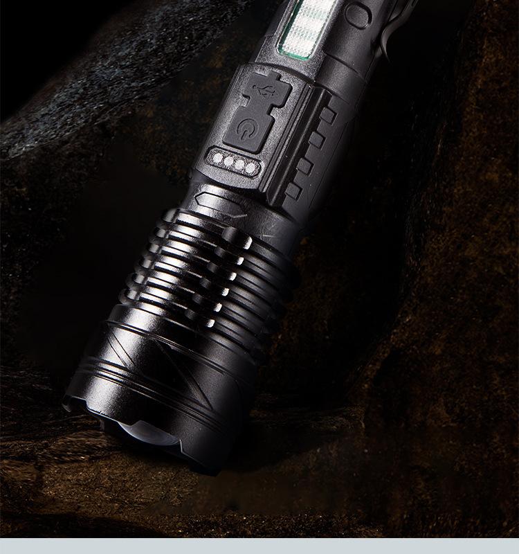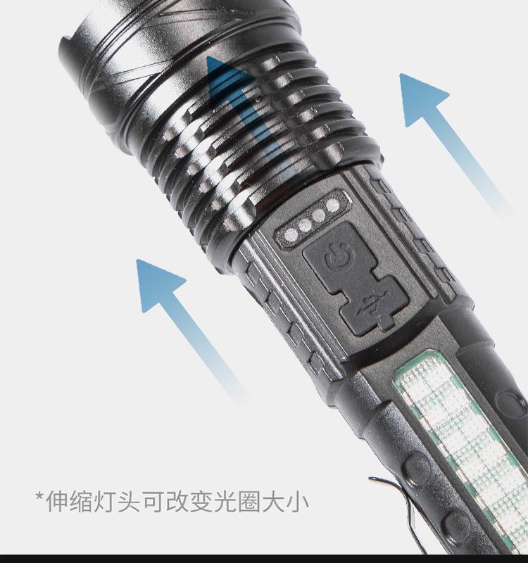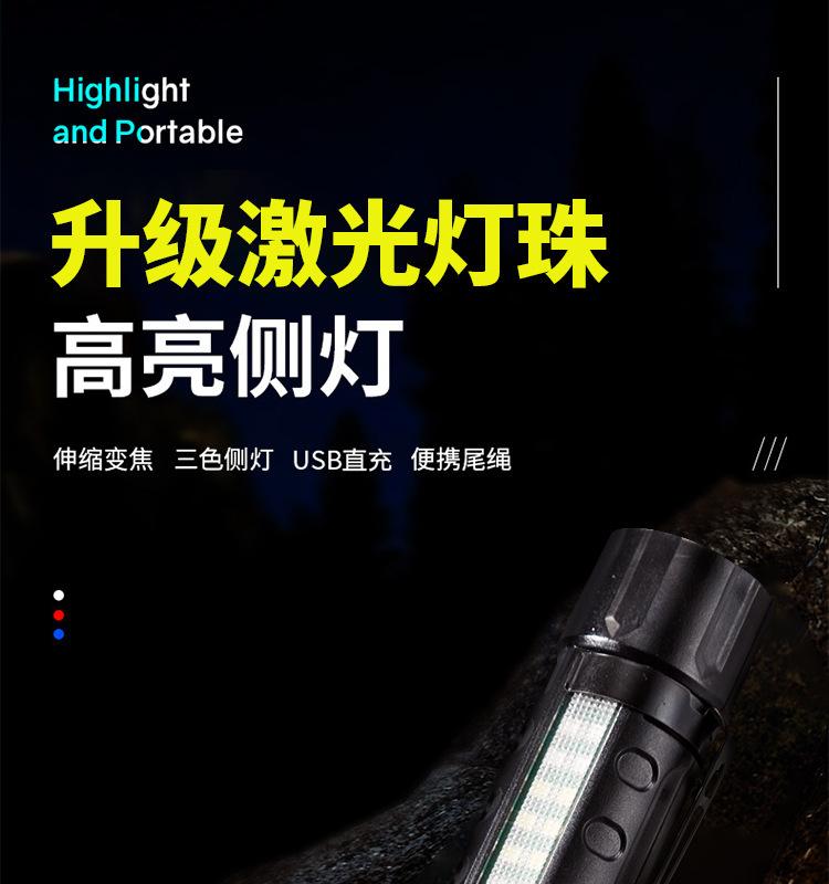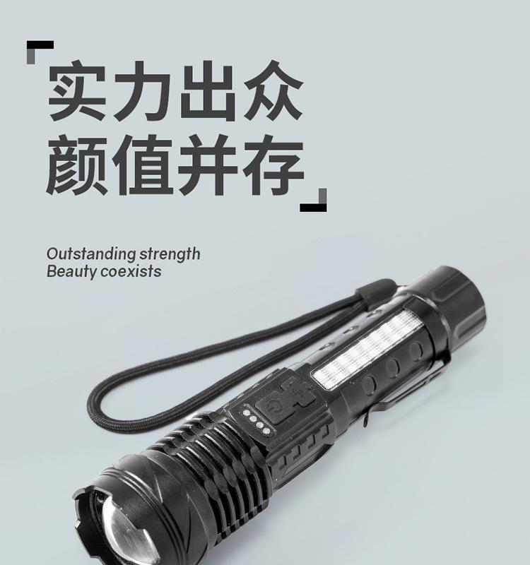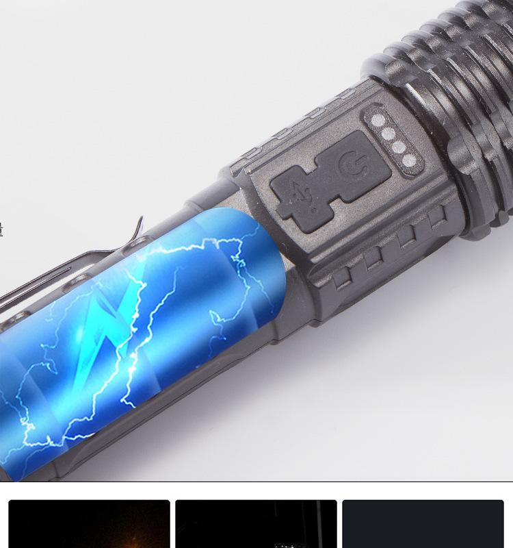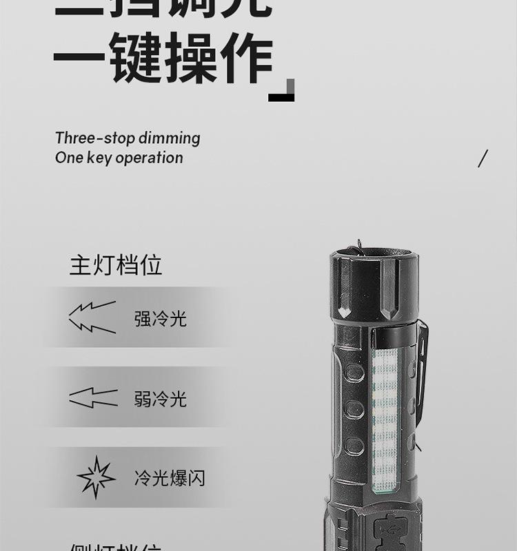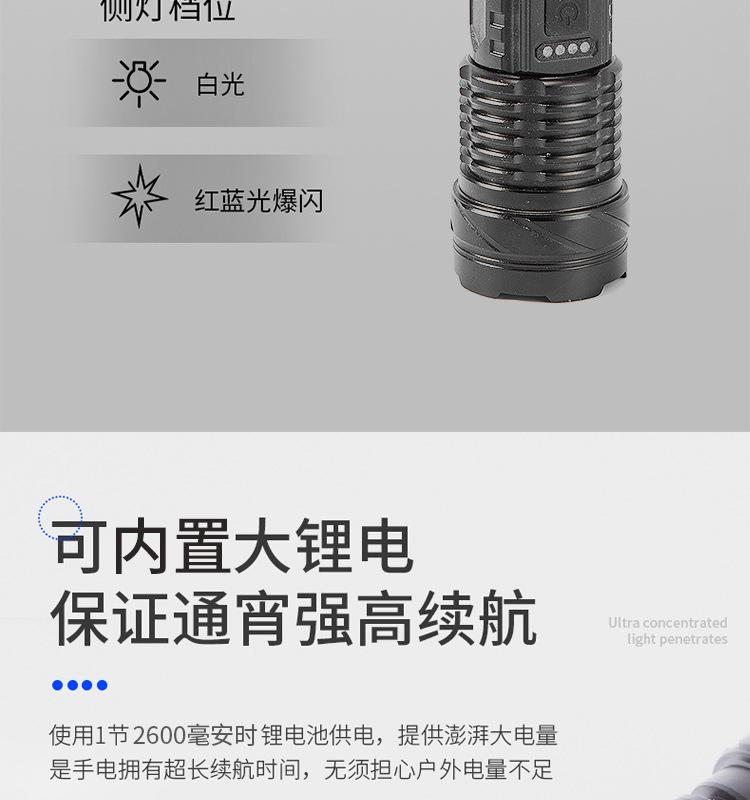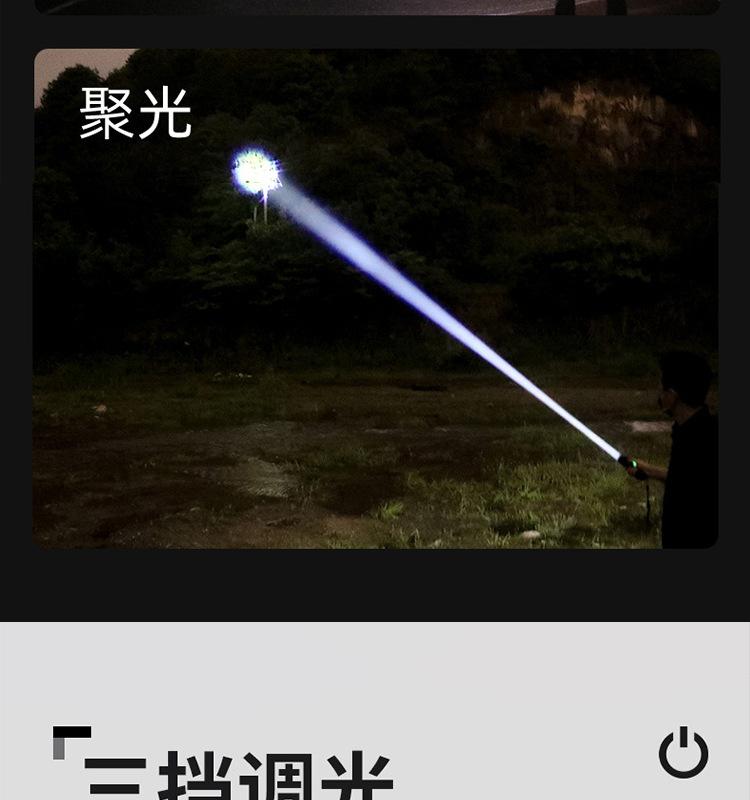 [Características del producto]: Luz fuerte, disparo de largo alcance, luz lateral, pantalla de potencia, cuerda de cola, clip para bolígrafo, fácil de transportar, tres fuentes de luz para satisfacer varios escenarios.