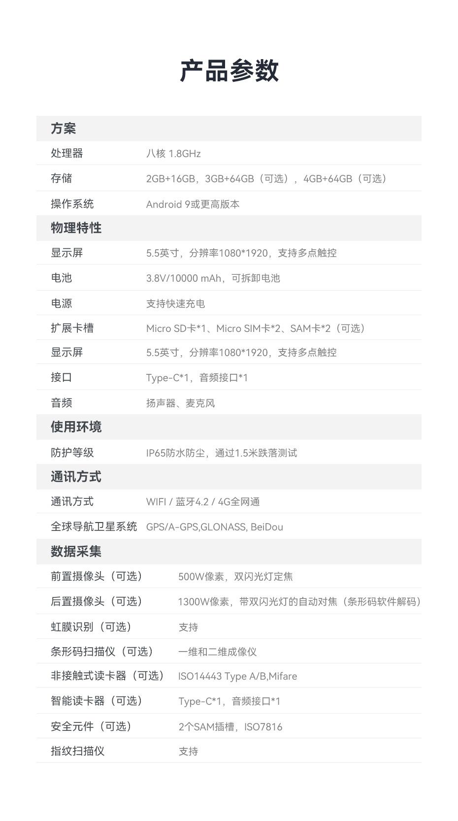 El Terminal Portátil de Verificación de Identidad S5 de Guangdong Tianbo es una tableta inteligente desarrollada independientemente por Guangdong Tianbo utilizando tecnología biométrica. Utiliza un procesador de 8 núcleos, está equipado con un sistema operativo Android 9, está equipado con una pantalla capacitiva IPS multitáctil de 5.5 pulgadas 1080*1920 y está equipado con una cámara de alta definición. Tiene reconocimiento facial, verificación de tarjeta de identificación, reconocimiento de huellas dactilares, reconocimiento de código QR y otras funciones en uno, realizando reconocimiento híbrido de identidad. Sistema de navegación por satélite preciso: funciones integradas de posicionamiento GPS/A-GPS, GLONASS, Beidou, comprende la situación laboral del personal de primera línea y facilita el despliegue y la guía del trabajo. El nivel de protección es superior a IP65, soporta caídas y se adapta a varias escenas complejas.