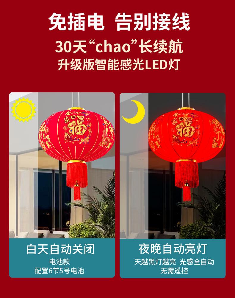2023 Nueva linterna roja eléctrica sin enchufe, autoconstruida, para puerta de villa, balcón, inalámbrica, inteligente, fotosensible, luces LED para palacio