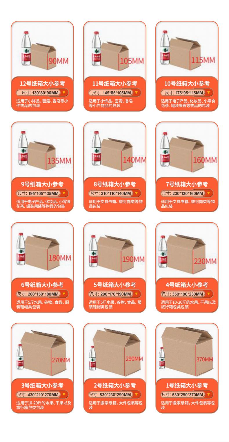 Serie de puntos:Las cajas de envío postal de Taobao n.° 1-12 están siempre disponibles, con papel corrugado de tres o cinco capas, a elegir. Se envían dentro de la provincia de Guangdong y el envío es gratuito para pedidos superiores a 88 yuanes. Si la mercancía está disponible, el pedido se puede enviar antes de las 20:00 del mismo día (excepto en circunstancias especiales y festivos). El servicio de envío predeterminado es Yousu Express y, en circunstancias normales (excepto en circunstancias excepcionales), llegará a la región del Delta del Río de la Perla antes del día siguiente.