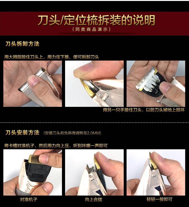 Accesorios del producto: caja de embalaje, manual de instrucciones, cuatro peines guía, un cargador (se puede cambiar a estándares estadounidense, europeo, británico y australiano), una botella de aceite lubricante (deje un mensaje si no desea exportar), un cepillo de limpieza