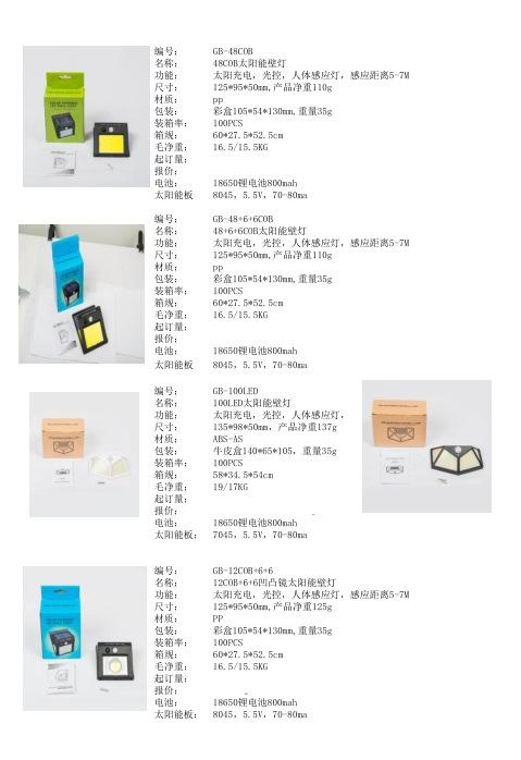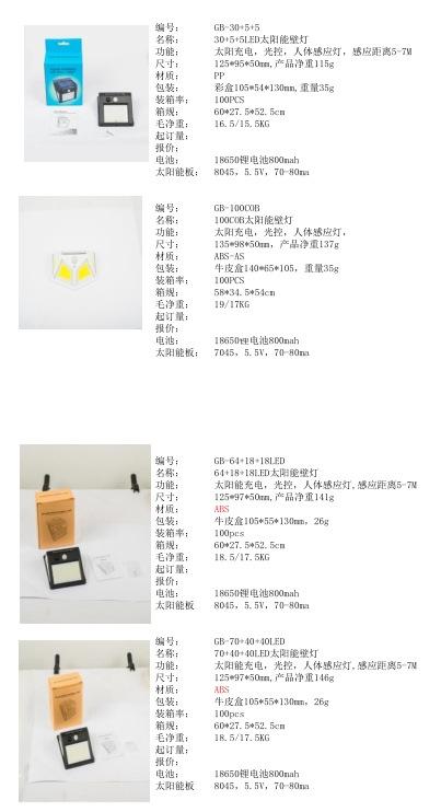1. Potencia del panel solar: 5.5V 0.55W 2. Batería de litio: 1*18650 1200 mAh 3. LED: 20 perlas de lámpara 2835 importadas de Taiwán con una temperatura de color de 6000-6500K 4. Material: Plástico ABS nuevo 5. Modo de trabajo: inducción infrarroja del cuerpo humano 6. Tiempo de carga: >8 horas 7. Tiempo de trabajo: una carga, 50 veces por noche, puede trabajar continuamente durante 4 días 8. Tamaño del embalaje: peso bruto 15 kg / peso neto 14 kg