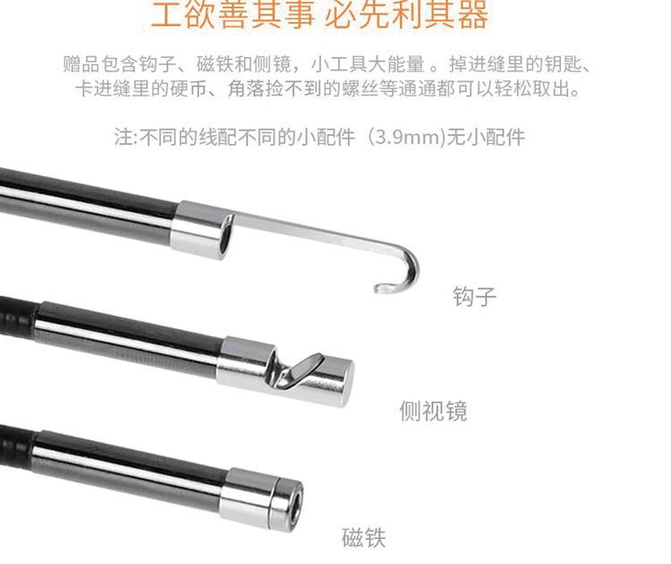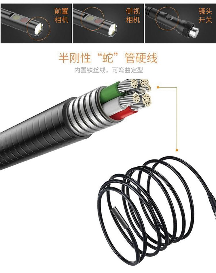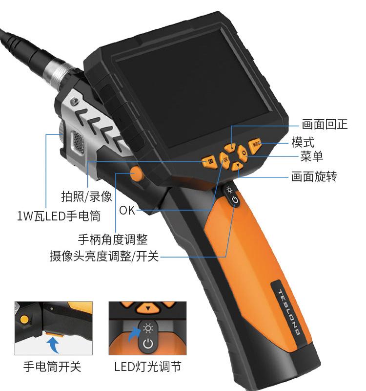 Diámetro: 5.5mm/7.6mm, Longitud de la manguera: 5 metros, Resolución: 1 millón de píxeles, Ángulo de visión: 70°, Rango de enfoque: 30mm-60mm, Iluminación auxiliar: 6 luces LED de brillo ajustable, Linterna LED: LED CREE de 1W, Temperatura de trabajo: 32°a113°F(0°a45°c)