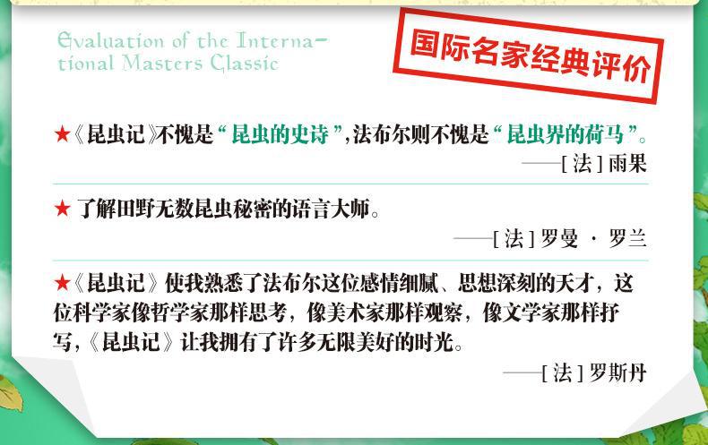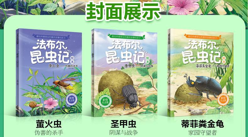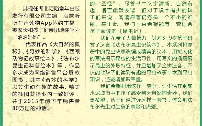 ¡Nuestro mundo es tan hermoso! Los insectos son como los espíritus de nuestro mundo, batiendo sus alas y cantando suavemente en los bosques y en la hierba. Sus vidas son mayormente cortas, pero sus historias son maravillosas. ¡Cuánto aman los niños a los insectos! Persiguen luciérnagas en la noche de verano y corren tras lindas libélulas; observan las bolas de estiércol de los escarabajos peloteros y escuchan a las cigarras cantar. Realmente quiero agradecer al Sr. Fabre. Este gran entomólogo, con su observación meticulosa y escritura delicada y tranquila, nos presenta el misterioso mundo de los insectos. Ama tanto a esos pequeños elfos que es mejor decir que dedica todo su amor a proteger esas pequeñas vidas en lugar de estudiar insectos. El grueso "Vida de los Insectos" es el legado más precioso que nos dejó el Sr. Fabre, que es amor - amor por la vida, amor por la naturaleza y amor por la vida. "Vida de los Insectos" es un clásico centenario y ha sido amado por los lectores chinos durante muchos años. Se entiende que hay no menos de cien versiones de "Libro de Imágenes de la Vida de los Insectos de Fabre" en el mercado editorial nacional. Nuestra versión fonética de "Libro de Imágenes de la Vida de los Insectos de Fabre" es, estrictamente hablando, un cuento de hadas de insectos. Cada historia se esfuerza por ser vívida e interesante: cada imagen se esfuerza por ser realista.