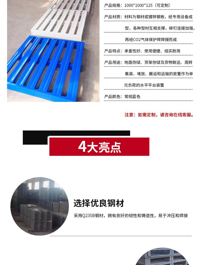 Los pallets de acero se utilizan principalmente para almacenamiento terrestre multipropósito, almacenamiento en estanterías, transporte intermodal de carga, rotación y otras series de pallets metálicos ultraligeros. Se emplean como plataformas horizontales para la colocación de unidades de carga para contenerización, apilado, manipulación y transporte. Constituyen uno de los equipos auxiliares más importantes para el almacenamiento y transporte industrial.