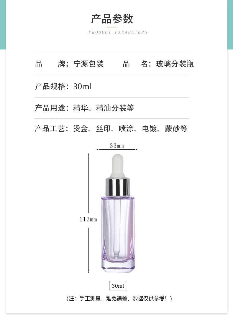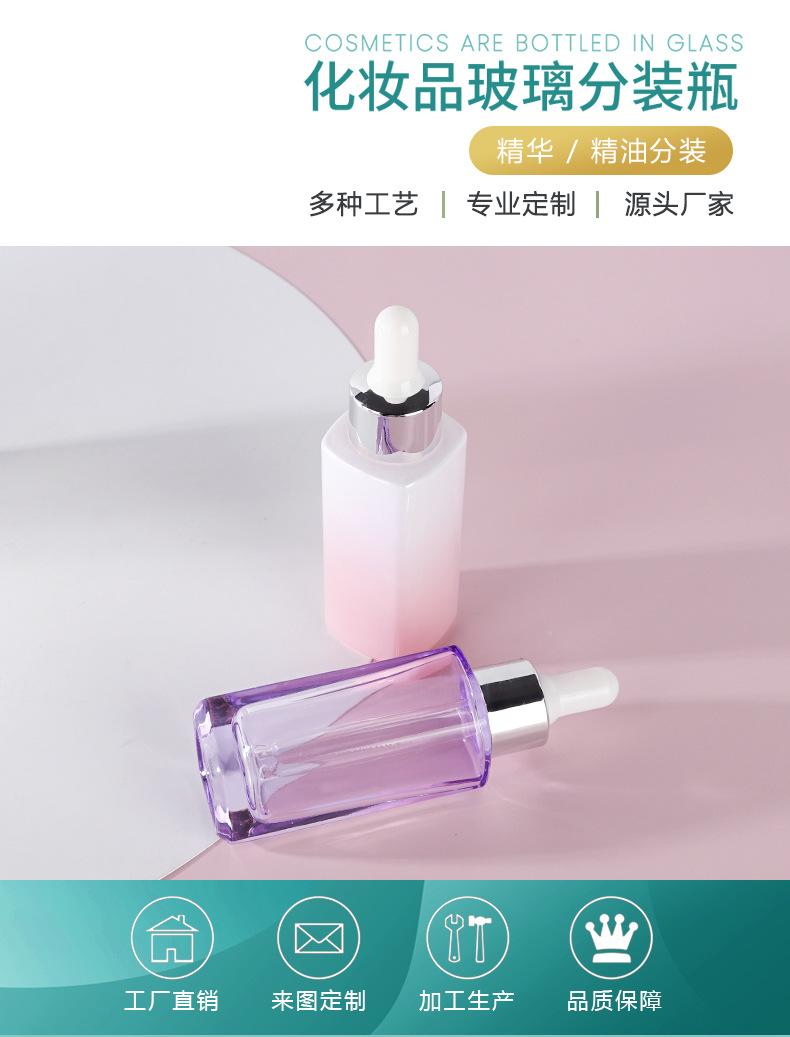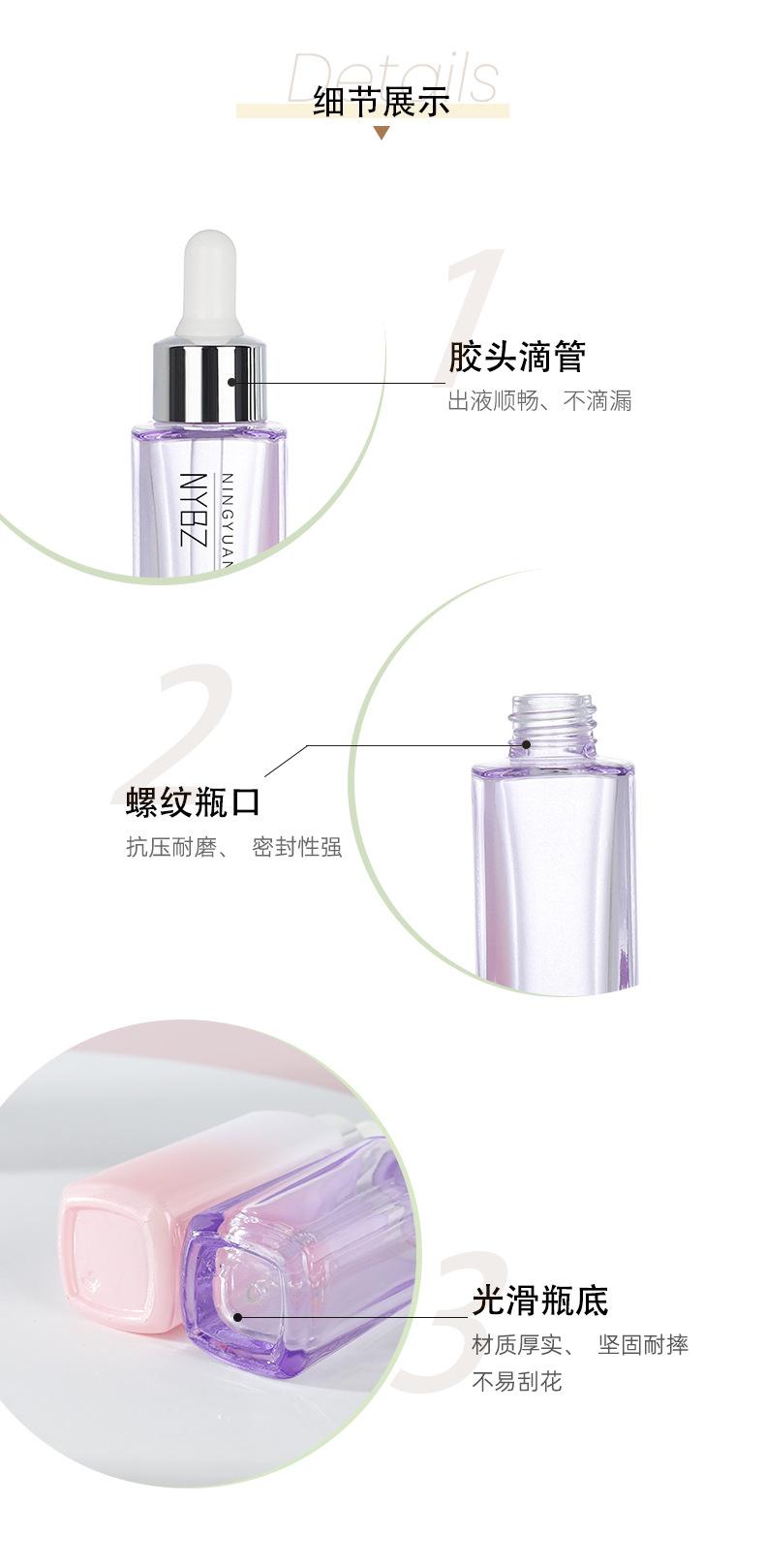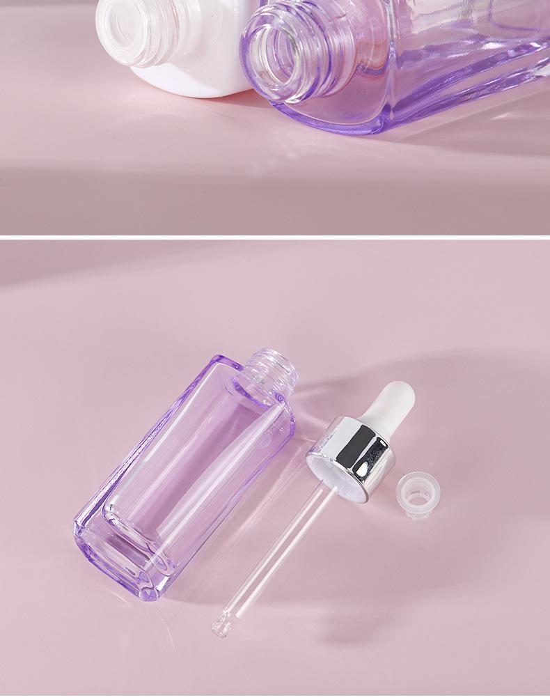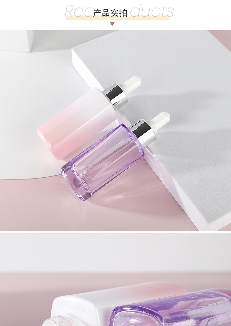 Botella rectangular de aceite esencial, botella de líquido, cabezal de plástico, gotero, subbotella de esencia, botella de vidrio de fondo grueso, material de embalaje cosmético