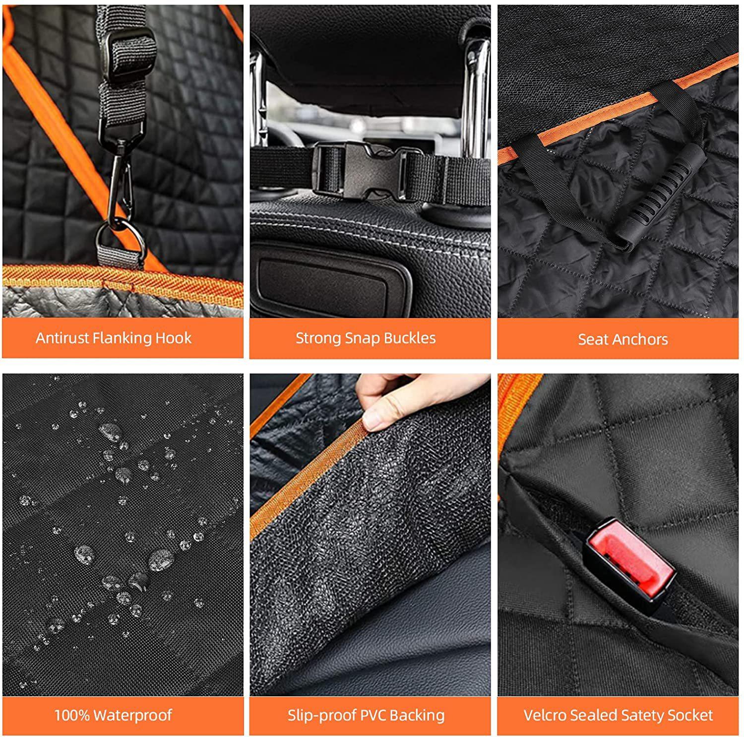 Diseño Profesional Seguro - 2 aberturas de velcro pueden insertarse en el cinturón de seguridad de su perro para evitar que se lastime durante ladridos de emergencia o giros bruscos. 4 anclajes para reposacabezas de alta resistencia y 2 anclajes para asientos asegurarán la funda para coche de su perro. El fondo antideslizante evita que su mascota se deslice, y por supuesto hay una abertura para el cinturón de seguridad para permitir que toda la familia viaje junta.