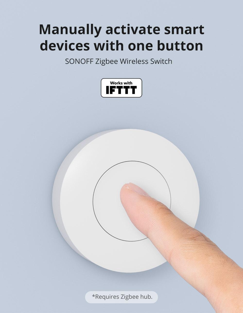 SONOFF SNZB-01P es un pequeño interruptor inteligente inalámbrico Zigbee que incluso puede caber en tu bolsillo, con acciones preestablecidas para pulsación única, pulsación doble y pulsación larga para controlar múltiples dispositivos.