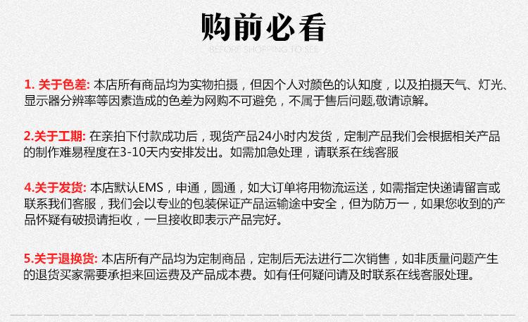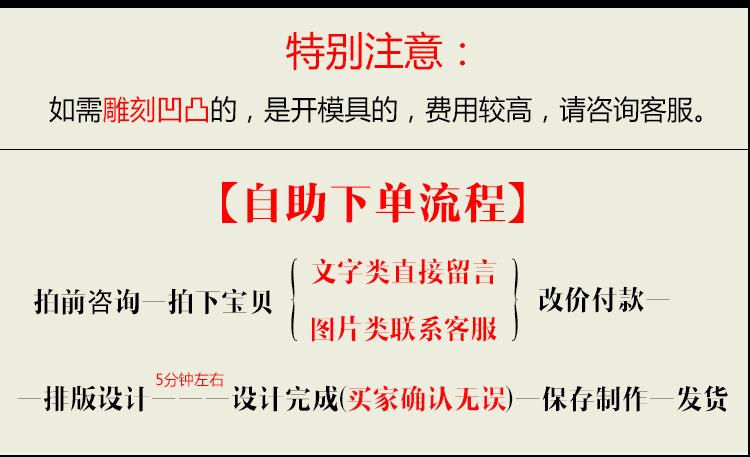 | Proceso de personalización | 1- Por favor, seleccione primero el estilo de producto que desea hacer. 2. Proporcione el contenido que desea producir a través de diversos métodos, como Wangwang o correo electrónico. Si graba un logotipo,Necesitas proporcionar formato vectorial. Si proporcionas el archivo de grabado tú mismo, los detalles del texto no deben ser menores a 3 líneas. Después de la conversión, envíalo al servicio al cliente. [Por favor, preste atención a si el texto contiene errores tipográficos, omisiones, signos de puntuación, fechas, etc. Nuestra tienda no se responsabiliza de las consecuencias de los errores de texto proporcionados por los compradores]. 3 - El diseñador creará representaciones para su confirmación según sus requisitos de grabado. Tras la confirmación, nuestro taller iniciará la producción. Si tiene alguna sugerencia o cambio, por favor, infórmenos antes de la producción. Una vez iniciada la producción, no se podrán realizar cambios. [Asegúrese de revisar cuidadosamente si el diseño cumple con sus requisitos. Su aprobación confirmará que es correcto.] |
