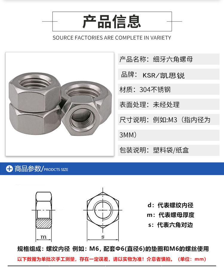 Tuerca de Acero Inoxidable 304 de Rosca Fina Hexagonal Tapa de Tornillo de Rosca Fina