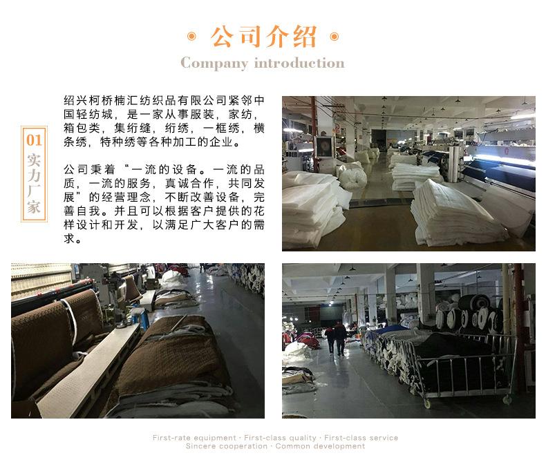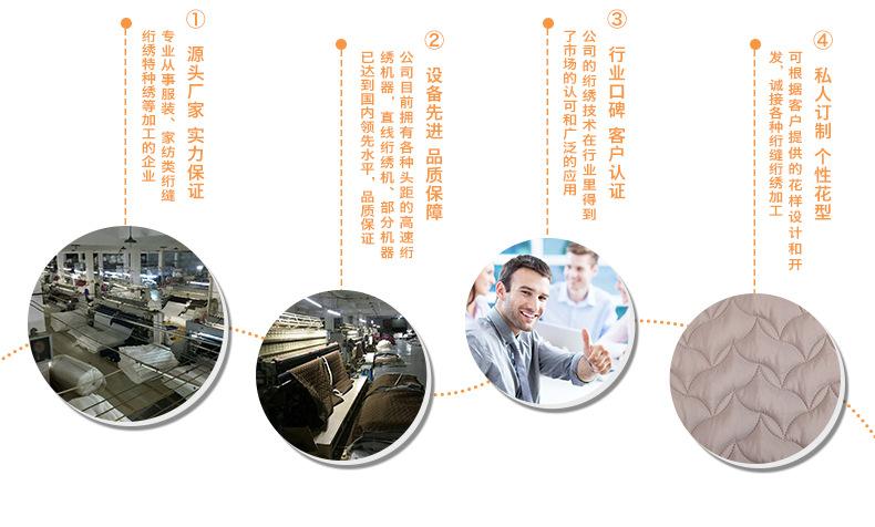 KeQiao nan hui textile co., LTD., está adyacente a shaoxing China textile city, se dedica a la ropa, textiles para el hogar, equipaje, acolchado, costura bordado, bordado de caja, bordado, las rayas de bordado especial y otras empresas de procesamiento. La empresa está atiborrándose de "equipo de primera clase. Calidad de primera clase, servicio de primera clase, cooperación sincera, desarrollo común" filosofía empresarial, mejorar constantemente el equipo, perfeccionarse. Y podemos diseñar y desarrollar según los diseños de los clientes para satisfacer las necesidades de nuestros clientes. La empresa actualmente cuenta con una variedad de especificaciones de máquina de acolchar de alta velocidad, máquina estéreo de doble aguja, máquina de un marco, máquina de barra horizontal, máquina de acolchar, etc. 90 juegos, algunas máquinas han alcanzado el nivel líder nacional. Se aceptan los productos de bordado especial con acolchado.