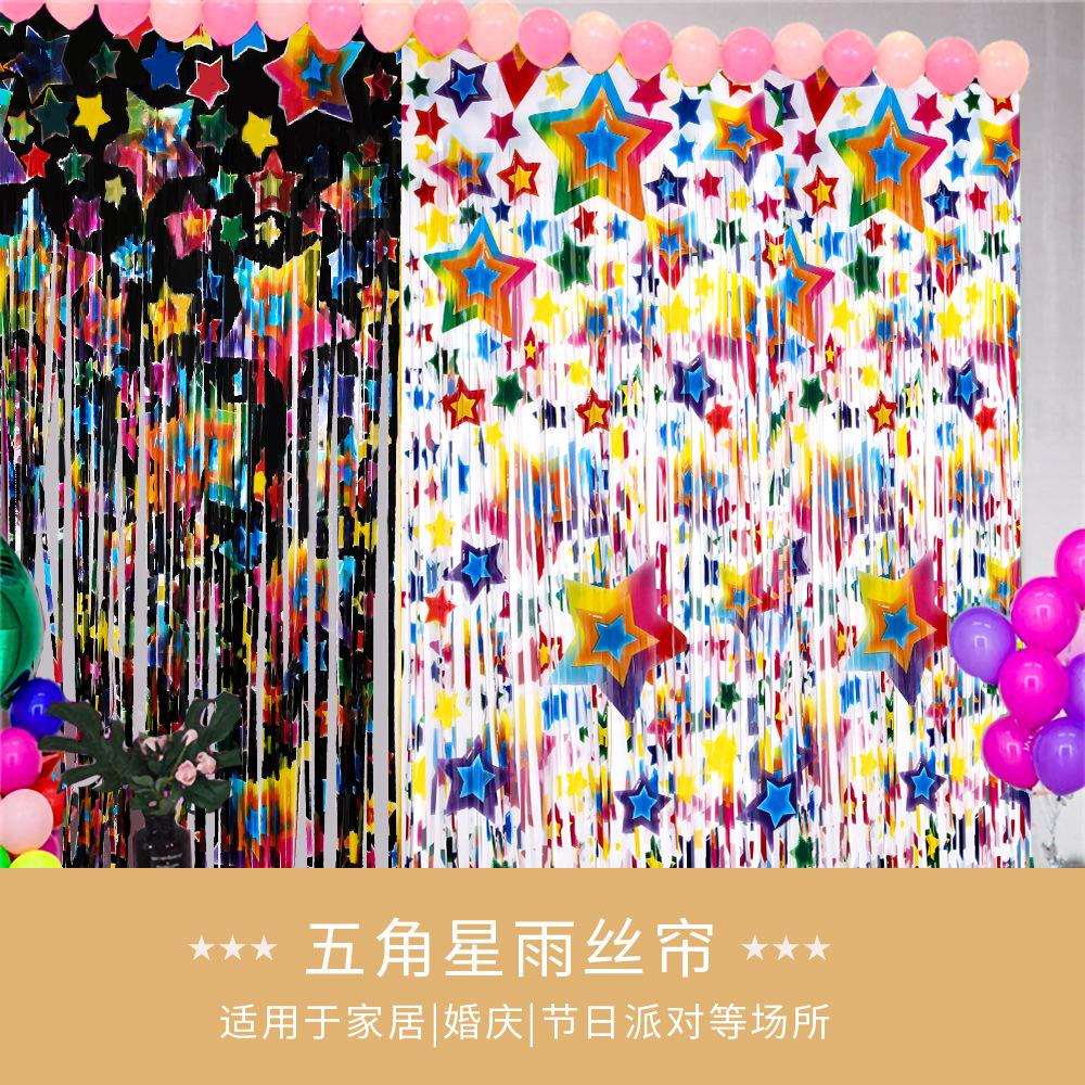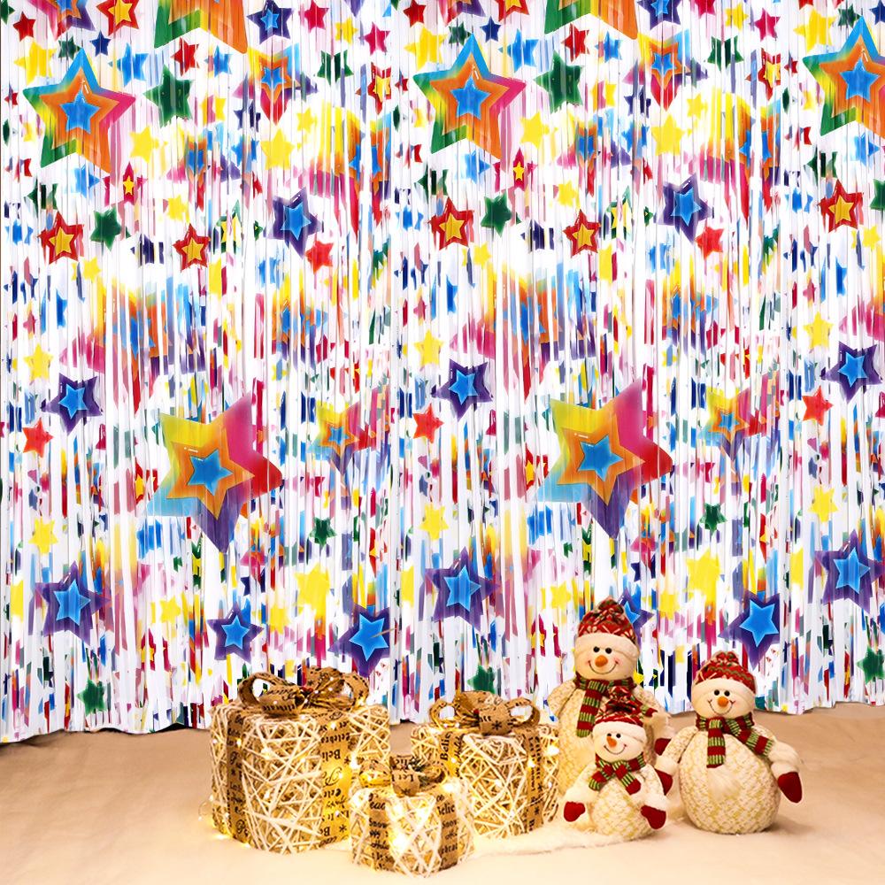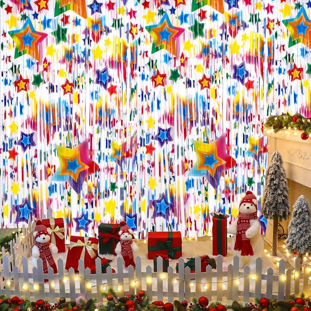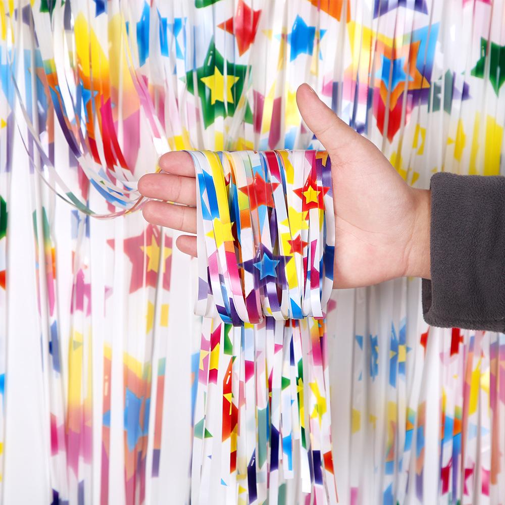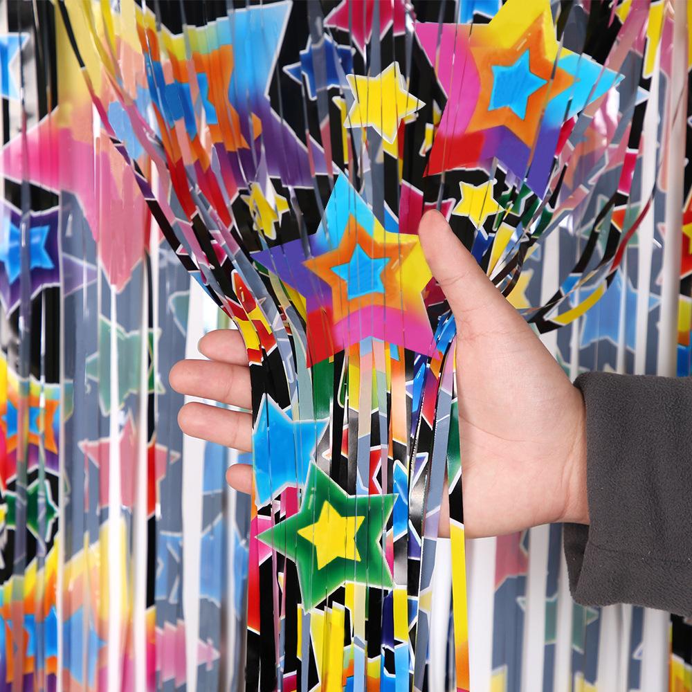 Cortina de lluvia de estrellas de cinco puntas con borlas, ideal para fiestas de cumpleaños de bebés.