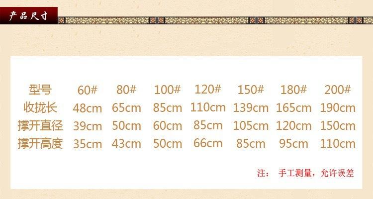 60# 70 piezas por caja (40cm de diámetro, aproximadamente 30cm de altura cuando está abierto) 80# 60 piezas por caja (50cm de diámetro, aproximadamente 40cm de altura cuando está abierto) 100# 30 piezas por caja (60cm de diámetro, aproximadamente 50cm de altura cuando se abre) 120# 24 piezas por caja (80cm de diámetro, aproximadamente 62cm de altura cuando está abierto) 150# 16 piezas por caja (100cm de diámetro, aproximadamente 72cm de altura cuando está abierto) 180# (120cm de diámetro, aproximadamente 90cm de altura cuando está abierto) 200# (150 cm de diámetro, aproximadamente 100 cm de altura) 250# (190 cm de diámetro, aproximadamente 130 cm de altura cuando está abierto)