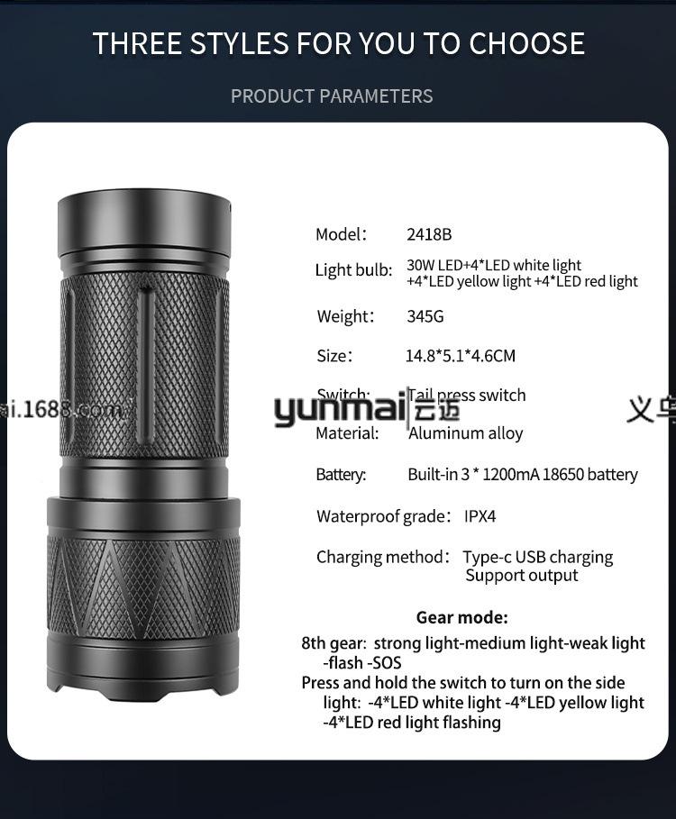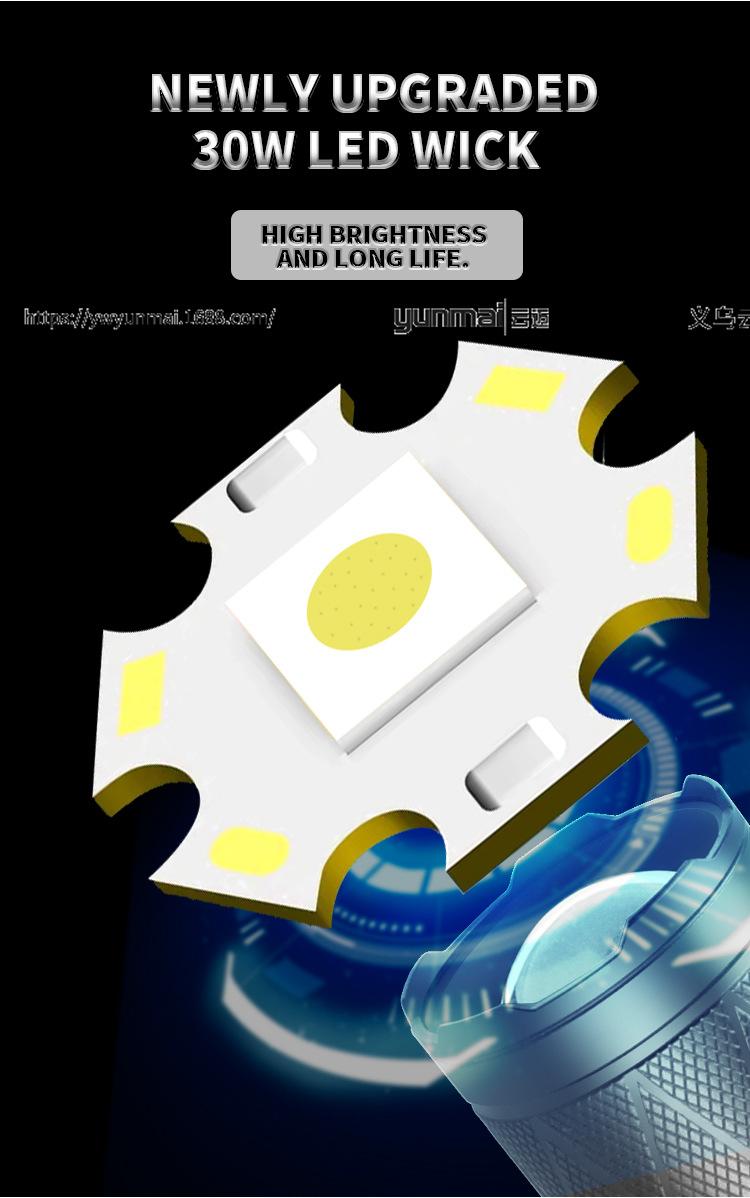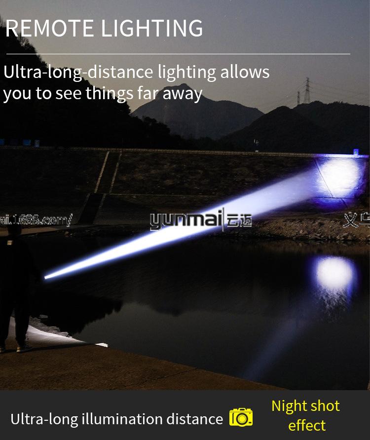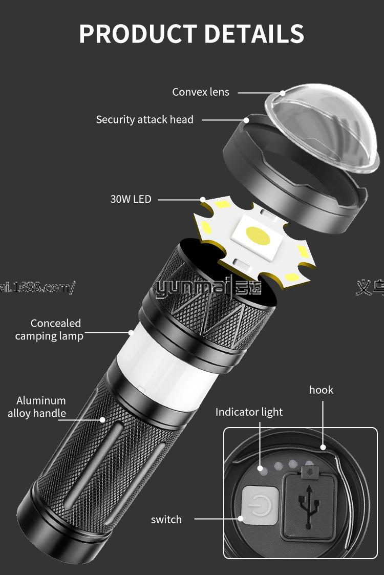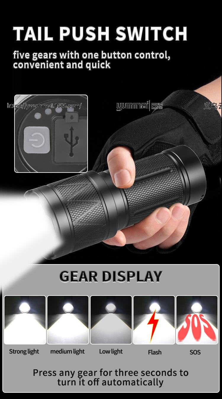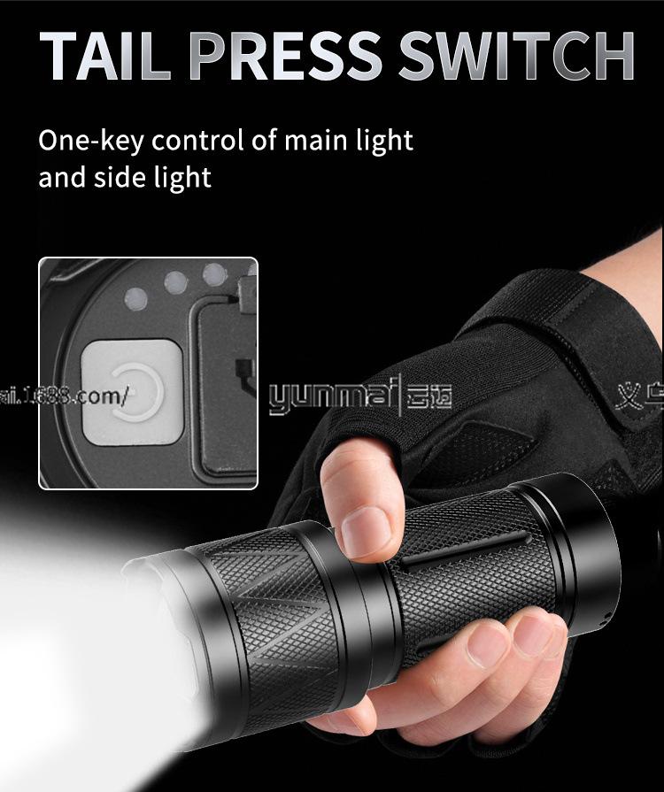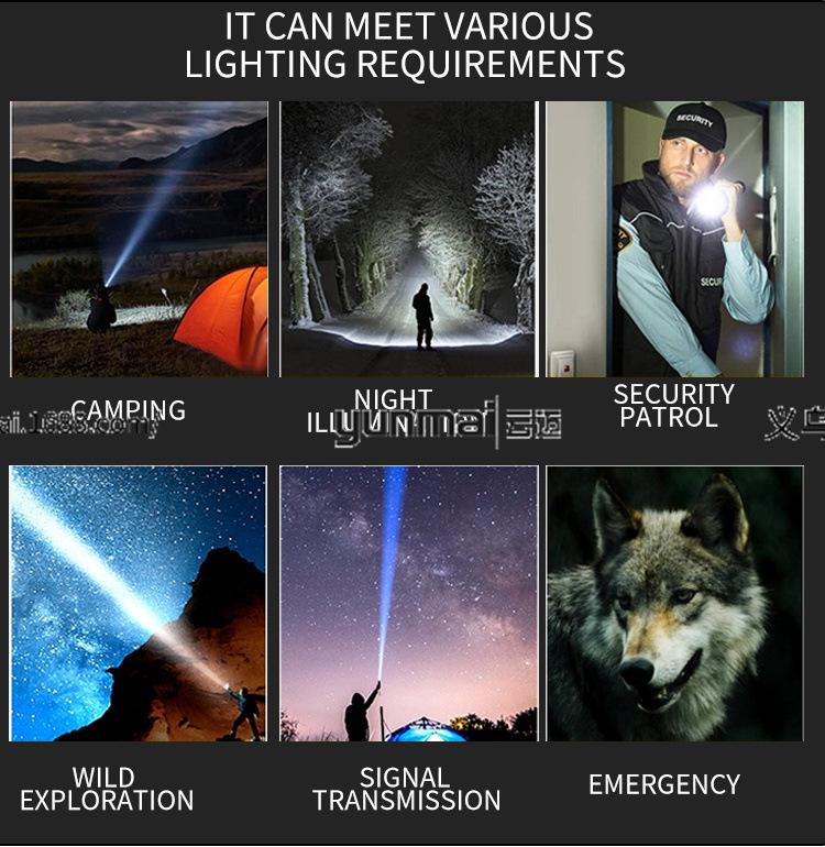 | Características | Pequeña bestia rentable Admite salida y puede usarse como un banco de energía en la naturaleza Foco láser blanco con zoom telescópico de alcance súper largo Cola con gancho Luz lateral que puede usarse como luz de camping |