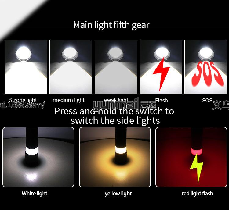 | engranaje | 8 niveles: luz fuerte - luz media - luz débil - flash rápido - SOS - pulsación larga para cambiar luces laterales 4*LED luz blanca - 4*LED luz amarilla - 4*LED flash de luz roja |