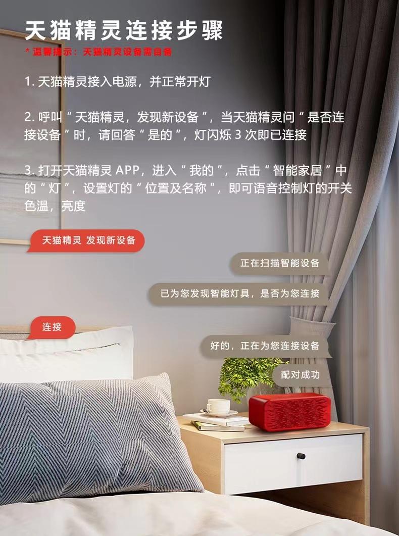 (4) Tmall Genie: Admite control por voz del altavoz inteligente Tmall Genie, admite control por aplicación móvil, viene con un control remoto, puede ajustar luz blanca, luz amarilla, luz neutra con brillo máximo y modo de luz nocturna, puede ajustar tanto la temperatura de color como el brillo. Compradores de la caja de voz Tmall proporcionan