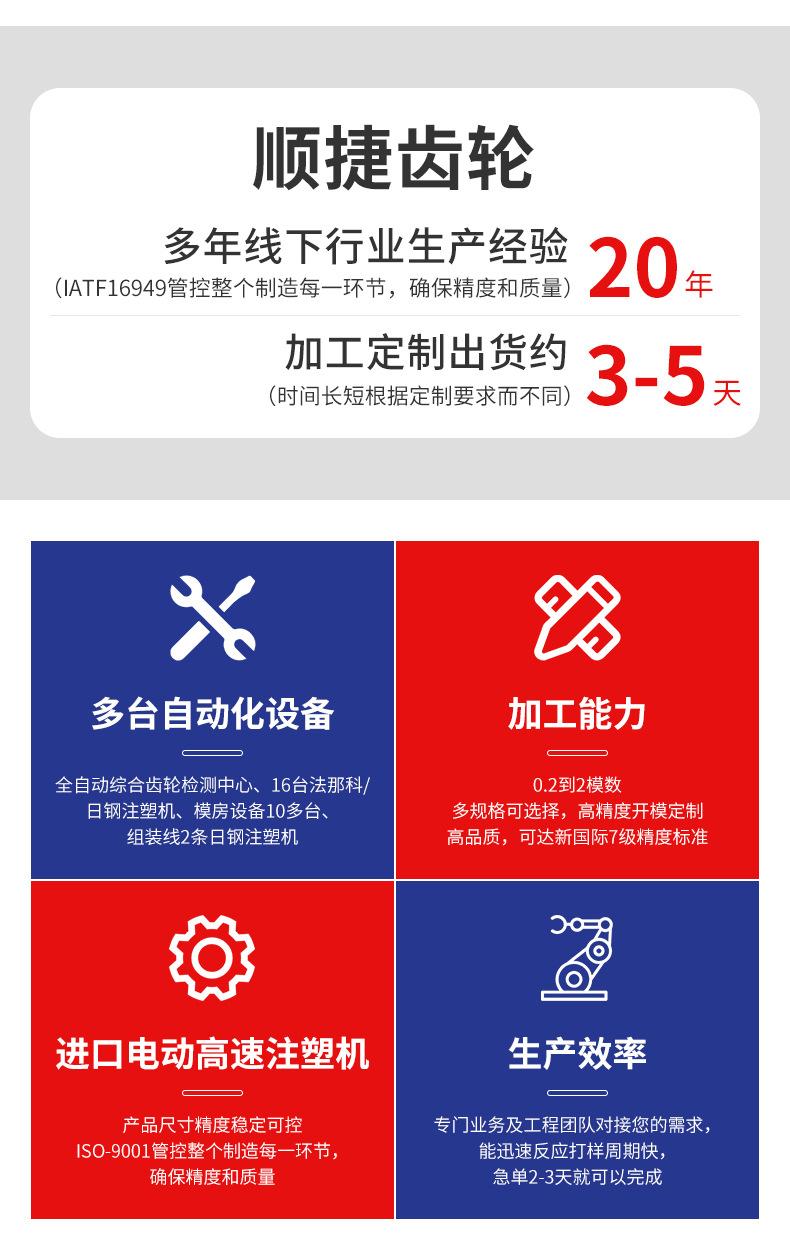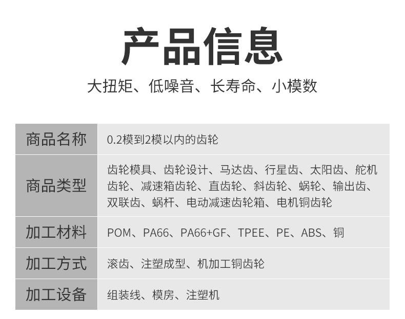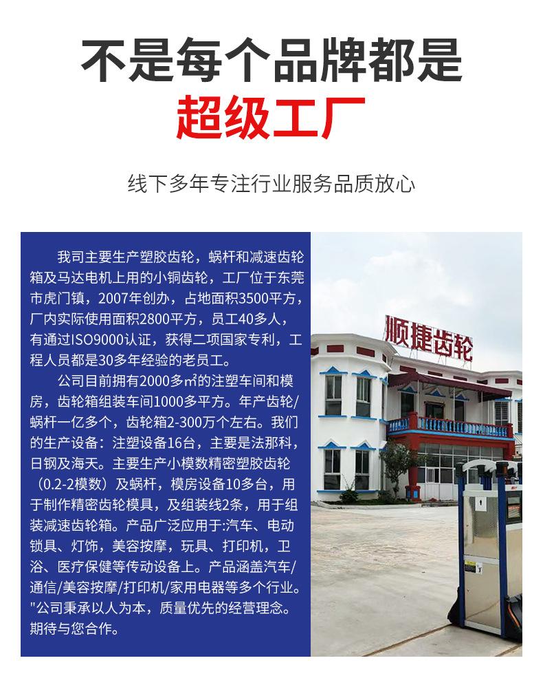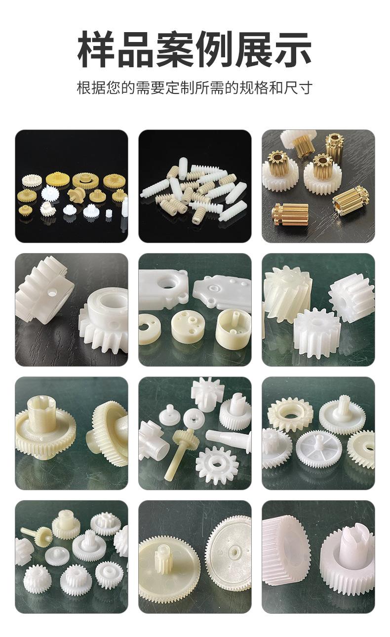 Nuestros principales productos son: engranajes de plástico para husillos (motores), engranajes de una y dos capas, coronas dentadas, engranajes cónicos, rodillos (poleas), engranajes helicoidales, engranajes sinfín, engranajes de embrague de seguridad, diversos engranajes y cajas de engranajes de plástico con formas especiales no estándar, engranajes de cobre de precisión, etc. También nos encargamos del diseño de moldes, la producción y el moldeo por inyección de piezas de plástico de precisión. Nuestros productos se utilizan ampliamente en: automóviles, cerraduras, iluminación, servidores (servos), reproductores de DVD, relojes, cámaras, temporizadores, trituradoras, fotocopiadoras, faxes, impresoras, aeromodelismo, juguetes, sanitarios, equipos de atención médica y otros equipos de transmisión.
