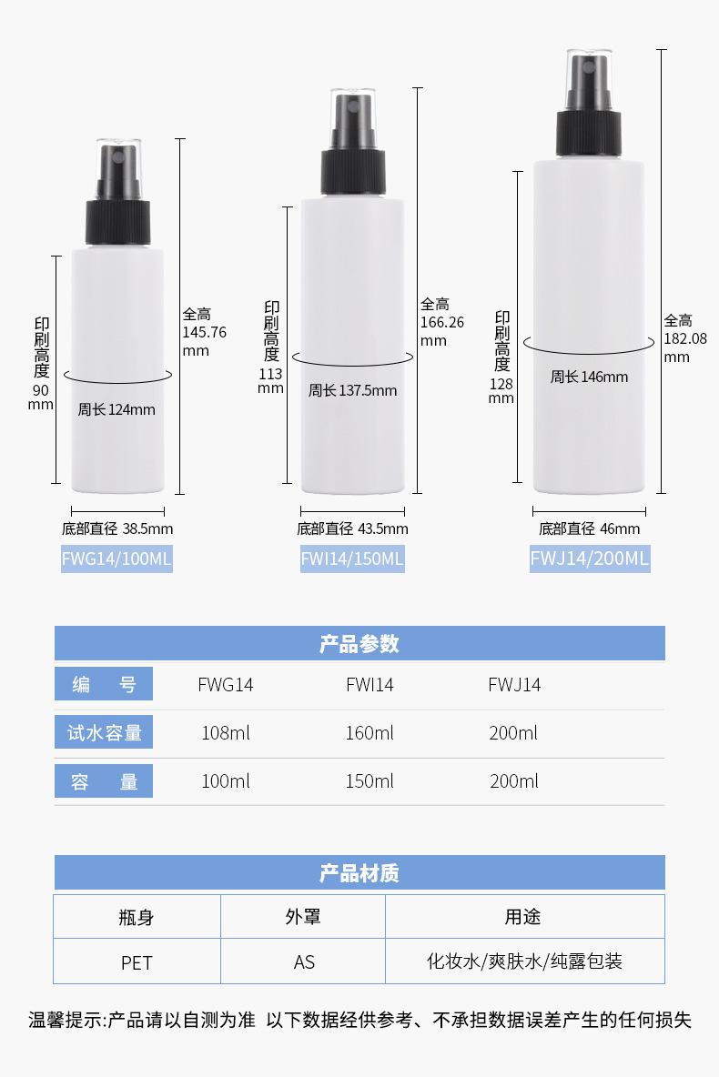 Material de embalaje Xumin: botella con pulverizador de 100-150 ml, botella de PET blanca, botella de rocío puro, botella de tóner, botella con pulverizador, embalaje cosmético.