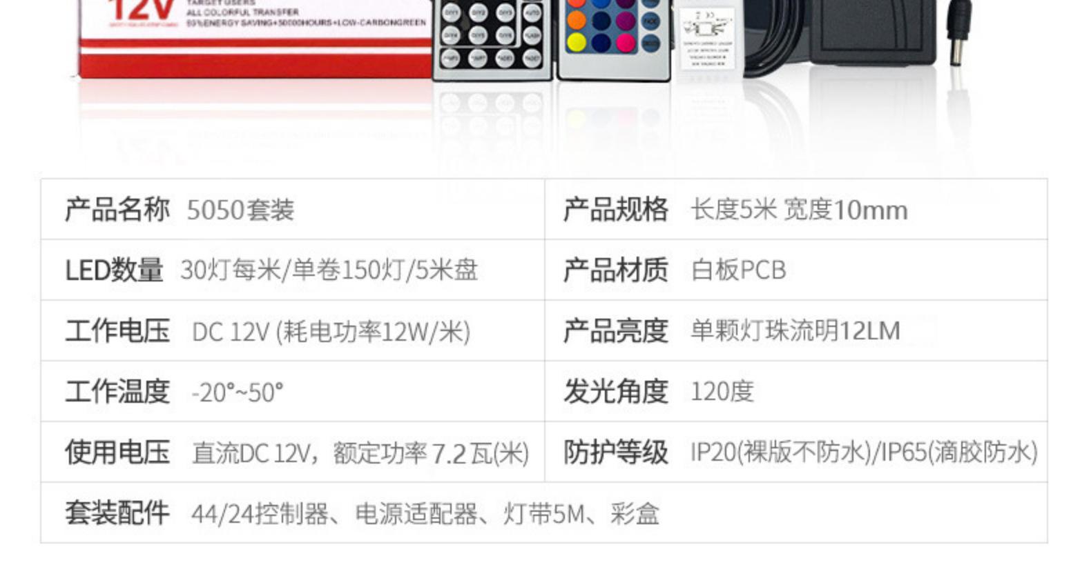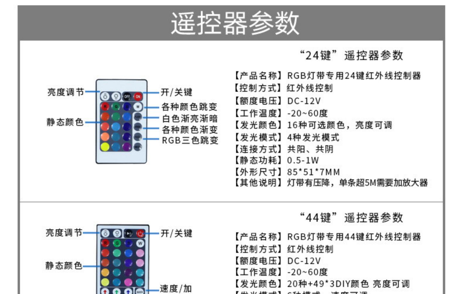 Caja de color LED 12v5050 adecuada para 30 luces por metro, luz suave colorida RGB con 24 teclas, controlador infrarrojo de 44 teclas