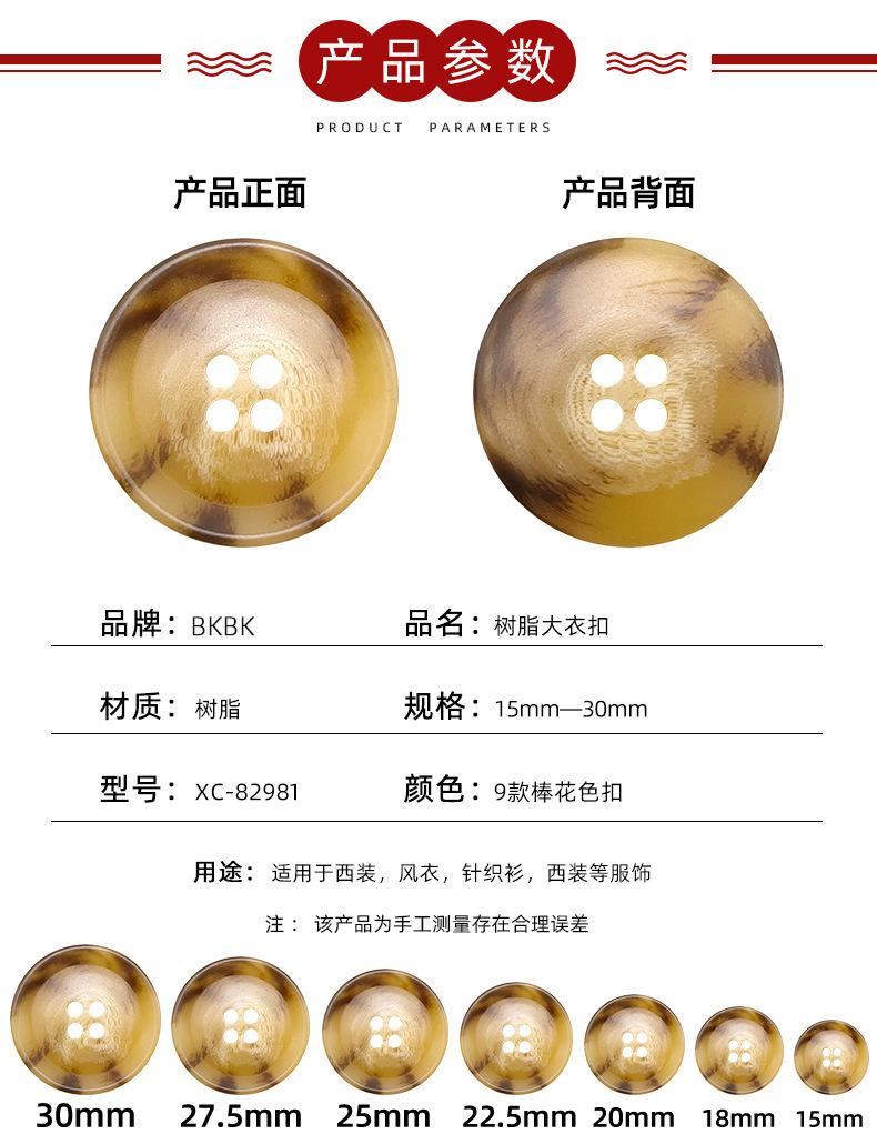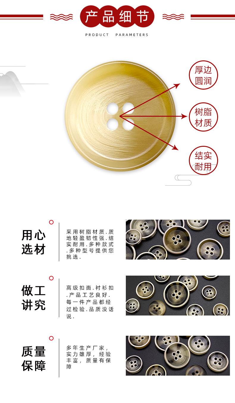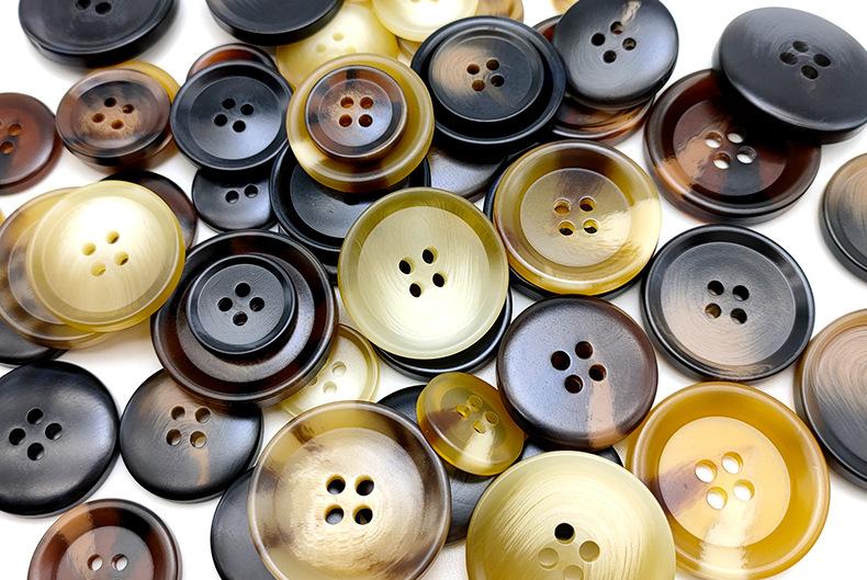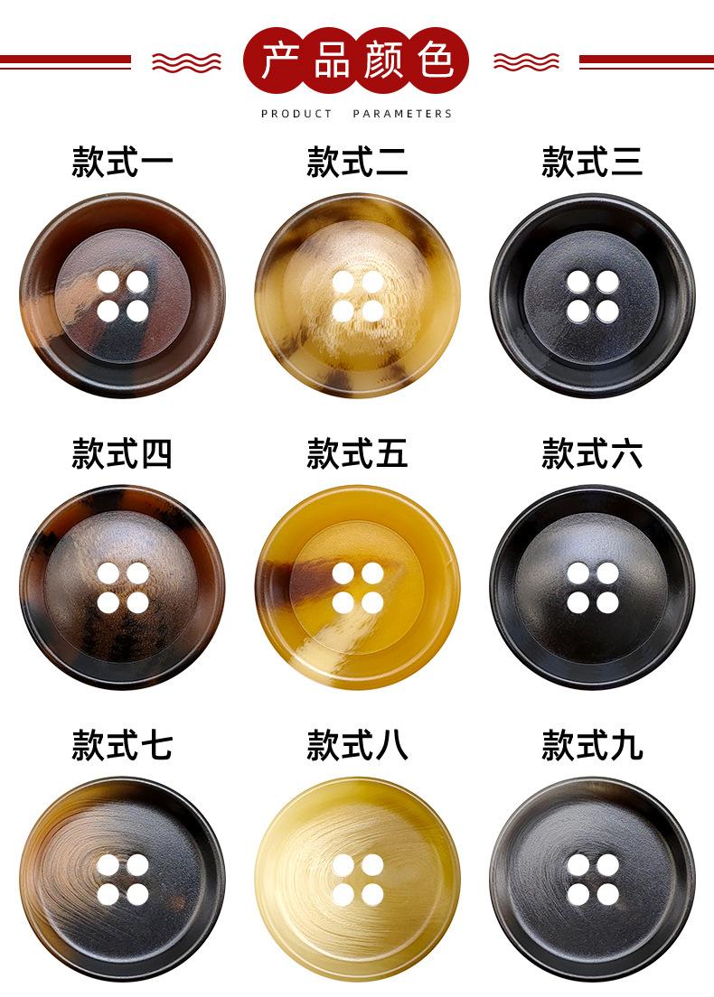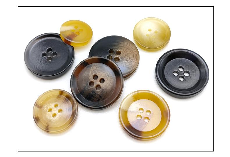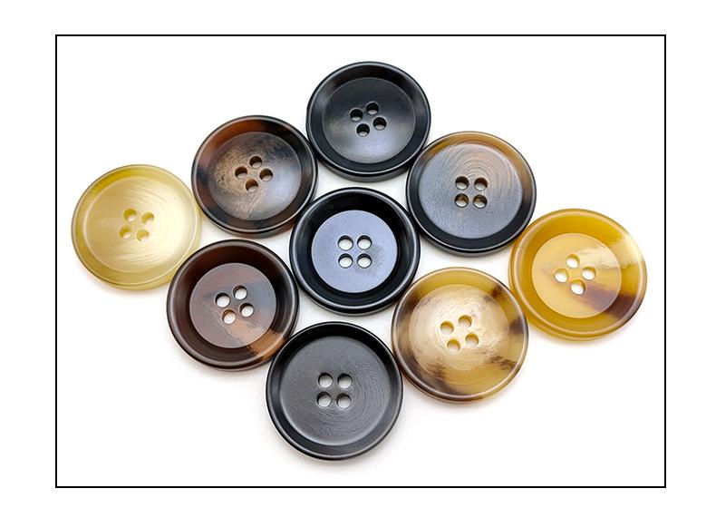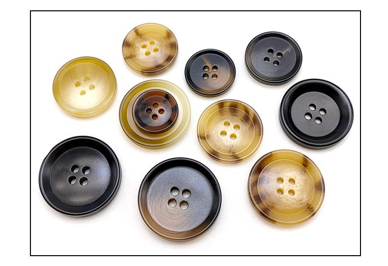 Botón de resina con imitación de cuerno, redondo, de cuatro ojales, para abrigo, cortavientos, traje, botones cosidos a mano, venta al por mayor