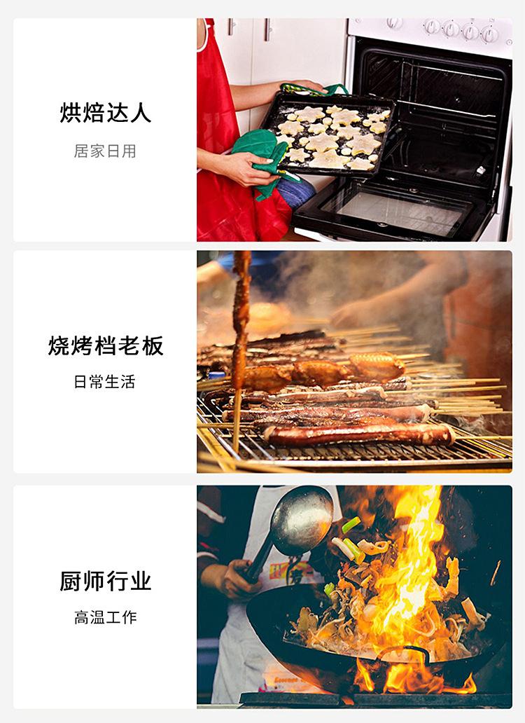 Industrias recomendadas: barbacoa, parrilla, repostería, horno microondas, horno, etc. Características del producto: resistente a altas temperaturas, antideslizante, retardante de llama, diseño de gancho para un fácil almacenamiento.