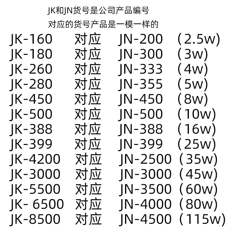 Recientemente, se han detectado falsificaciones de productos de la serie JK de nuestra empresa en algunos mercados. Actualmente, todos los productos de la serie que se venden en línea se han cambiado a la serie JN. A continuación, se muestra la tabla de correspondencia de potencia de las series JK y JN. Jinnuo Group garantiza que los materiales utilizados en los productos de las series JK y JN son los mismos. La razón por la que se dividen en dos series se debe principalmente a los diferentes canales de suministro. Compre con confianza.