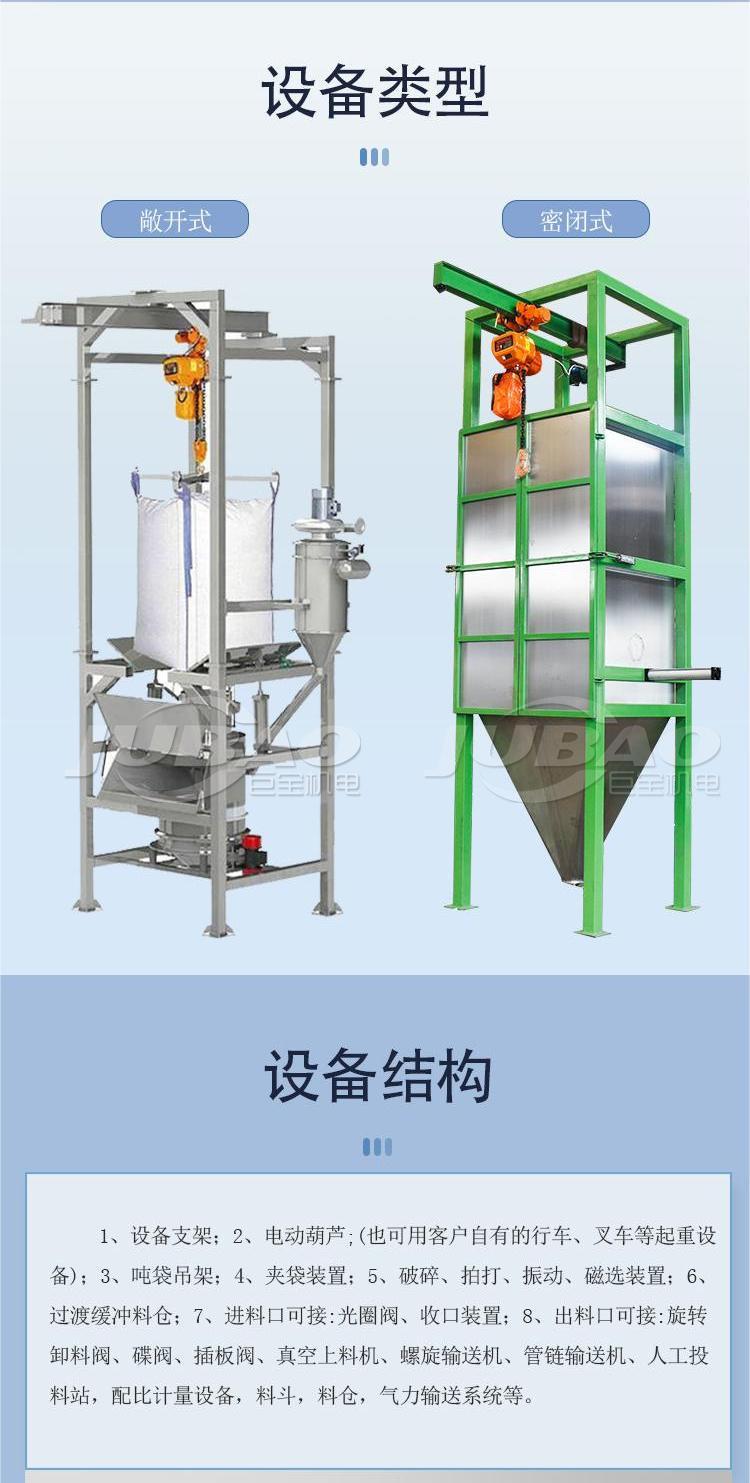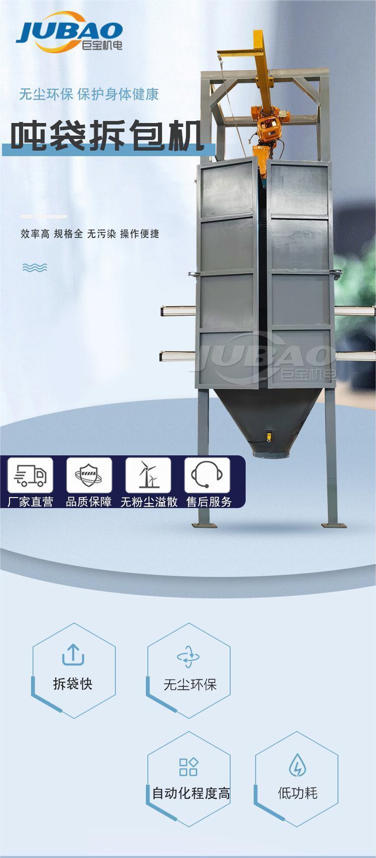 Estación de alimentación de bolsas de una tonelada, máquina desempaquetadora automática de bolsasEs un equipo automático de desempaquetado de bolsas, ideal para el envasado de materiales en bolsas grandes, como resinas plásticas, aditivos alimentarios, polvos secos y materiales granulares. Ofrece un alto grado de automatización, alta velocidad de desempaquetado, bajo consumo de energía y un excelente impacto ambiental. Se utiliza principalmente en plásticos, caucho, alimentos, medicamentos, minerales, productos químicos, materiales de construcción, granos, piensos y otros sectores.