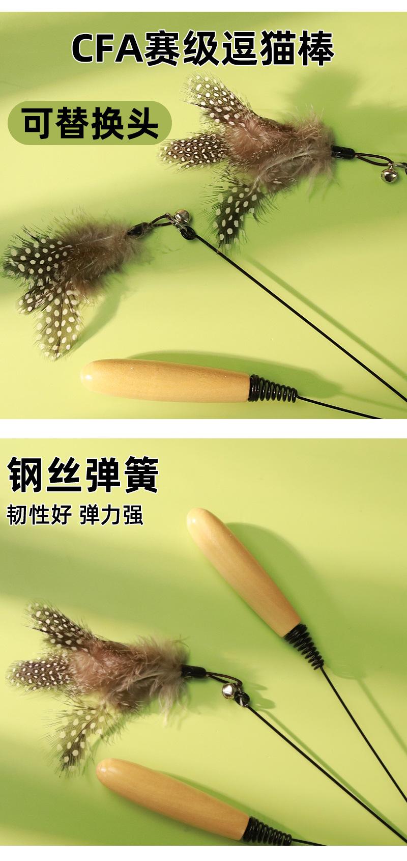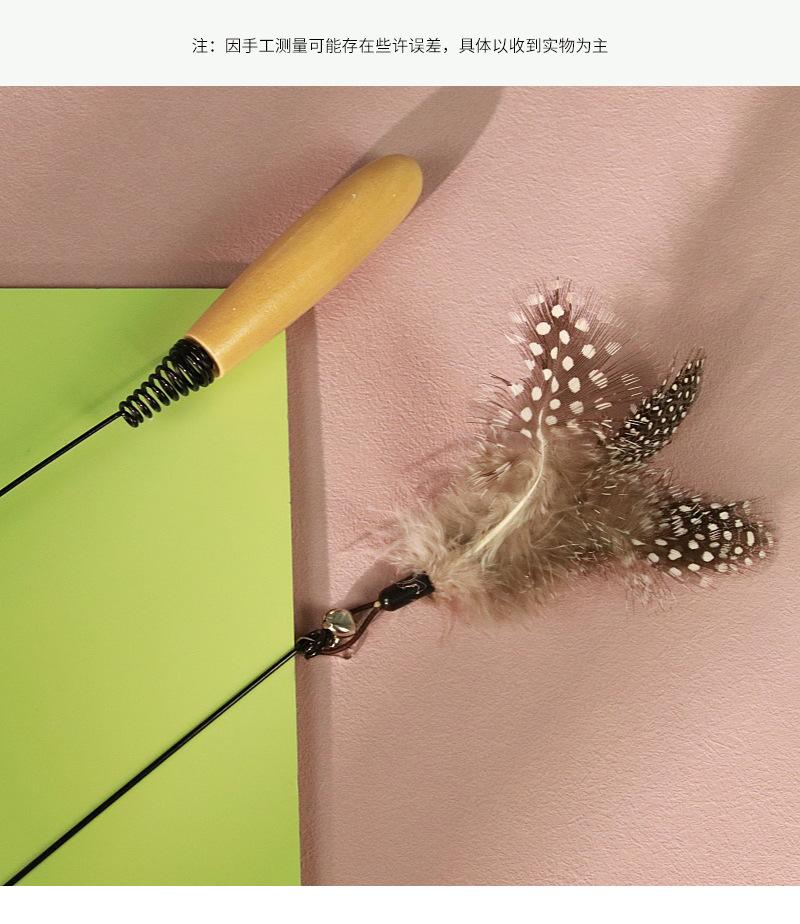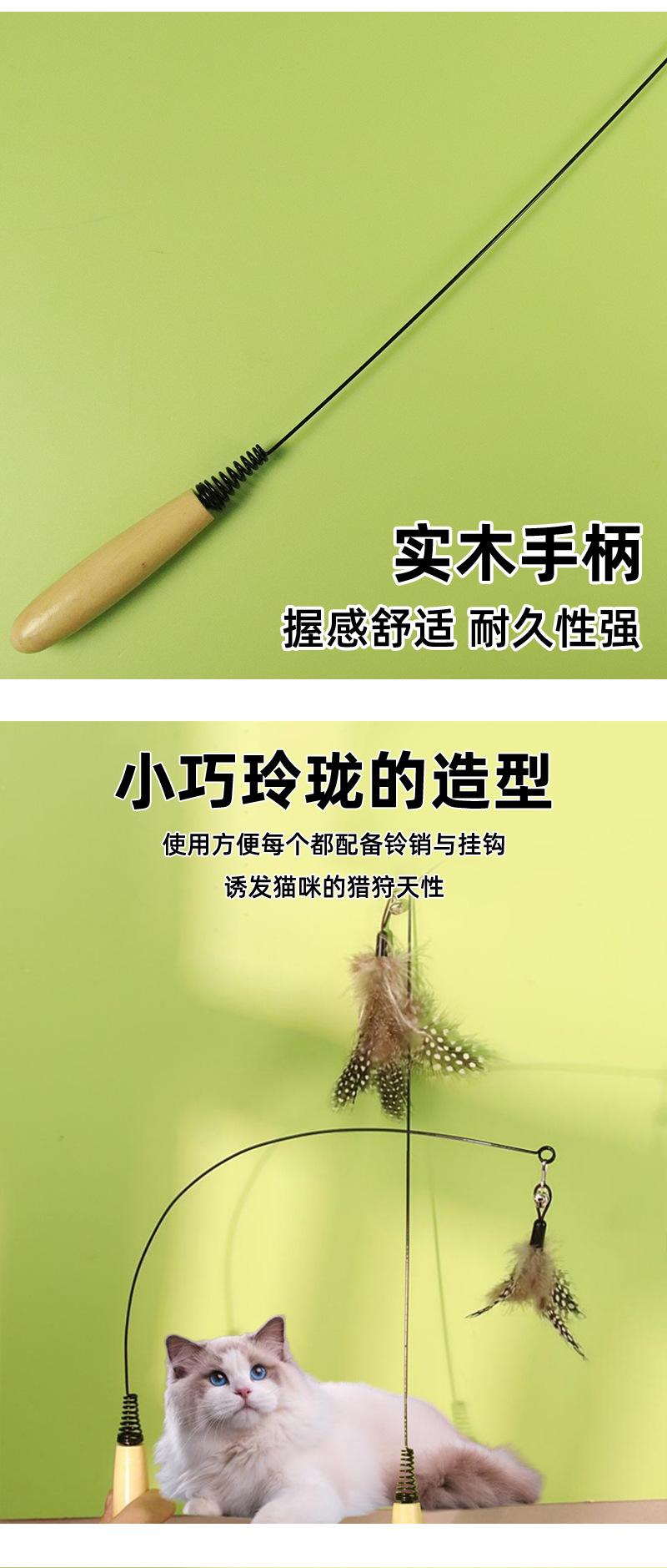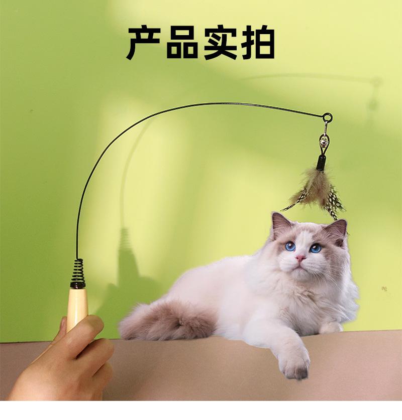 Fabricante de Juguetes para Gatos Venta al por Mayor Mango de Madera Maciza Resorte de Alambre de Acero Varita Teaser para Gatos Cabeza de Repuesto Pluma Sonido de Campana Palo Teaser para Gatos