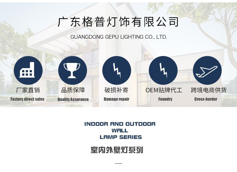 Guangdong Gepu Lighting es un fabricante y vendedor profesional de lámparas de pared LED impermeables para exteriores, lámparas de pared para dormitorios, salas de estar y otros tipos de lámparas de pared. La empresa cuenta con un amplio inventario de productos y se especializa en el comercio electrónico nacional Tmall, Taobao, el comercio electrónico transfronterizo Amazon y otras marcas, para resolver la presión de inventario y el ciclo de producción de diversas plataformas de comercio electrónico. Los vendedores de comercio electrónico están invitados a colaborar.