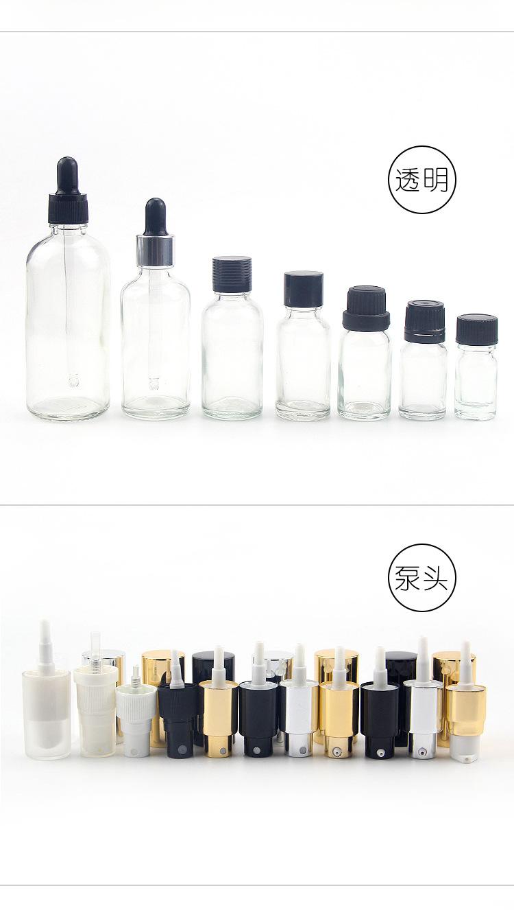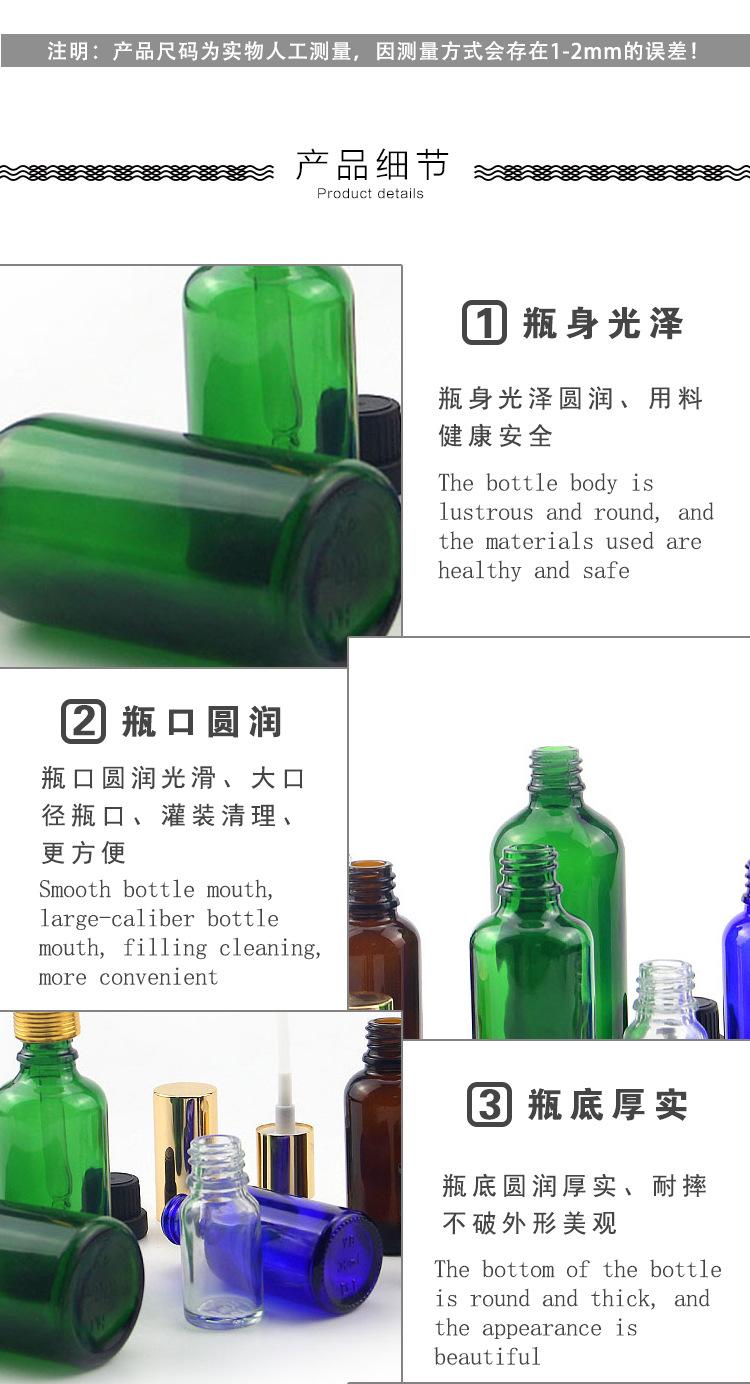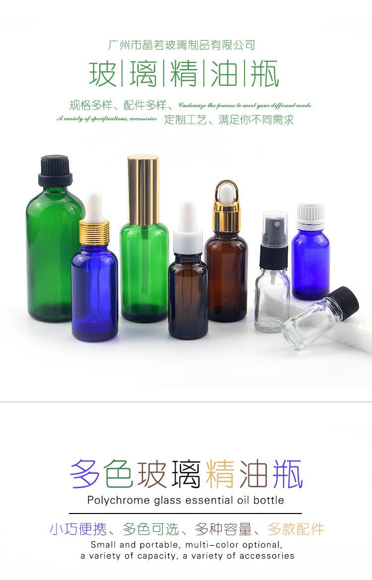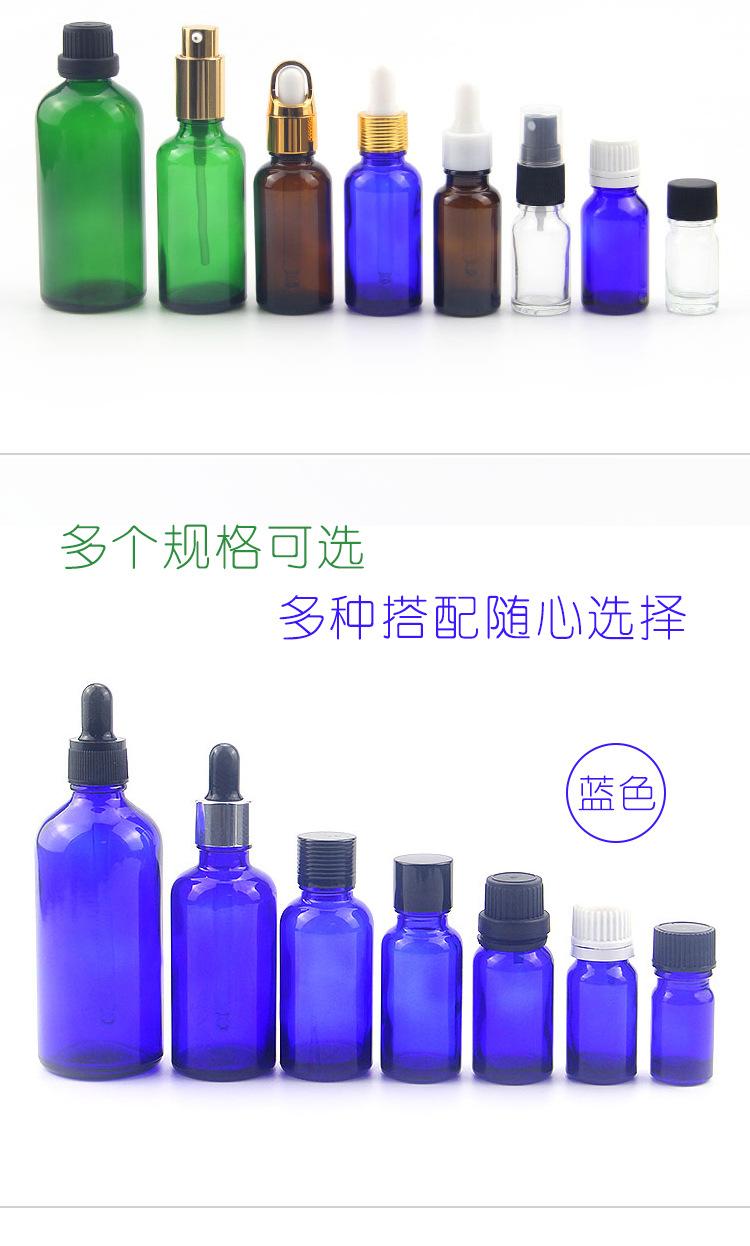 Venta al por mayor de aceites esenciales Botella vacía de vidrio transparente para aceites esenciales Sellada Botella marrón con gotero Sub-botella azul verde