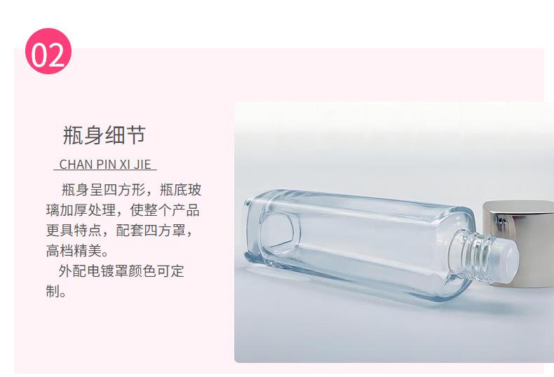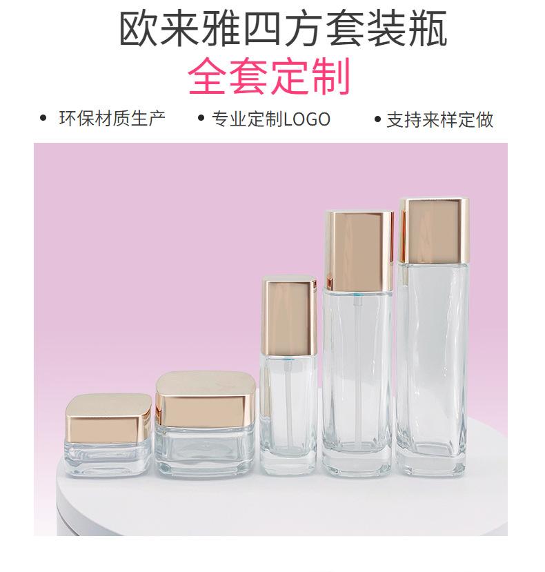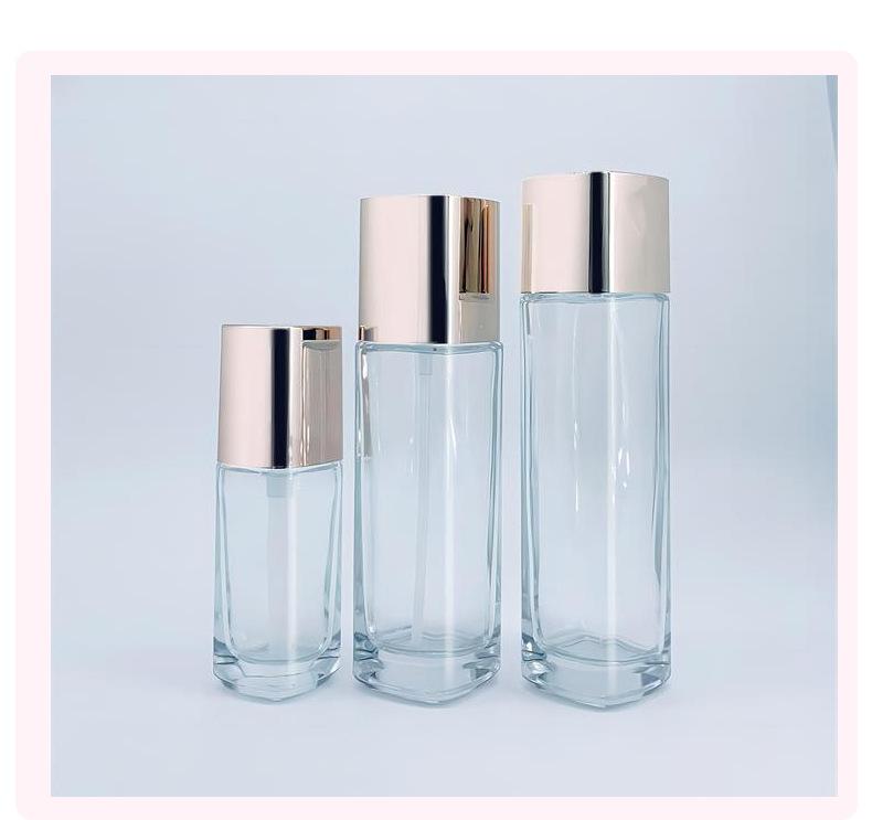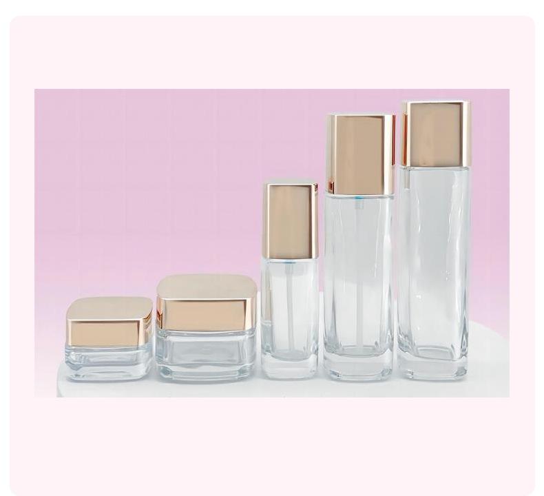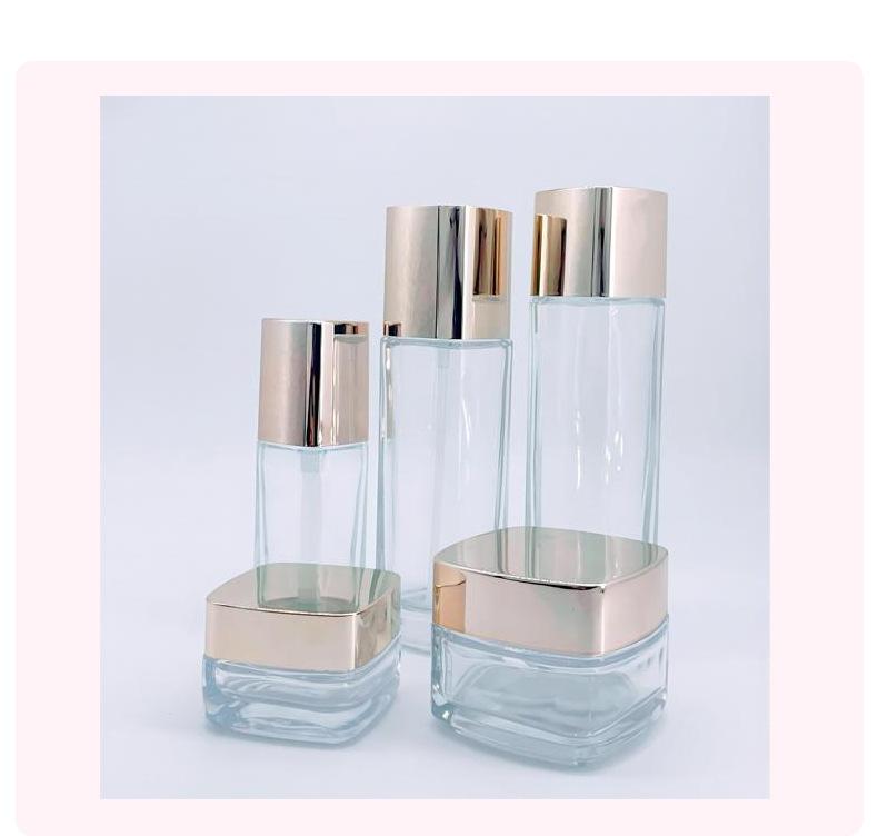 Botella de vidrio cosmética con base gruesa y cuadrada para crema de 50 g, emulsión de 40 ml y esencia de 100 ml.