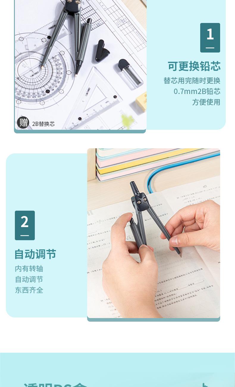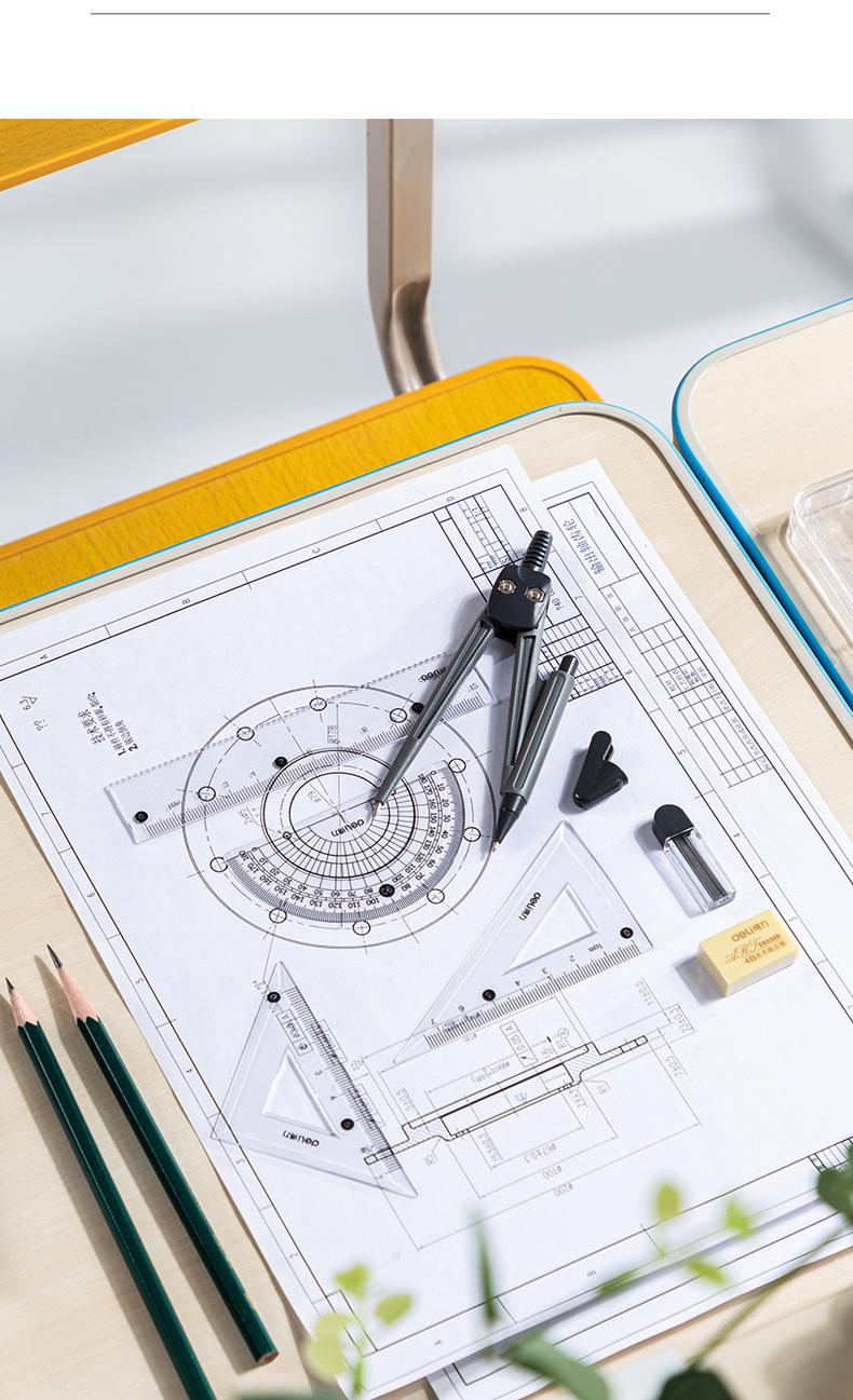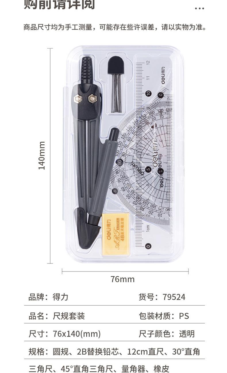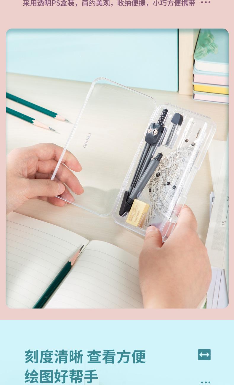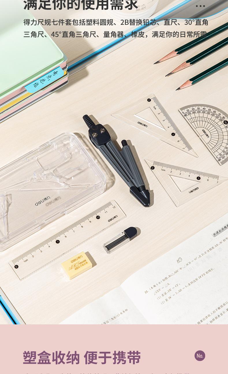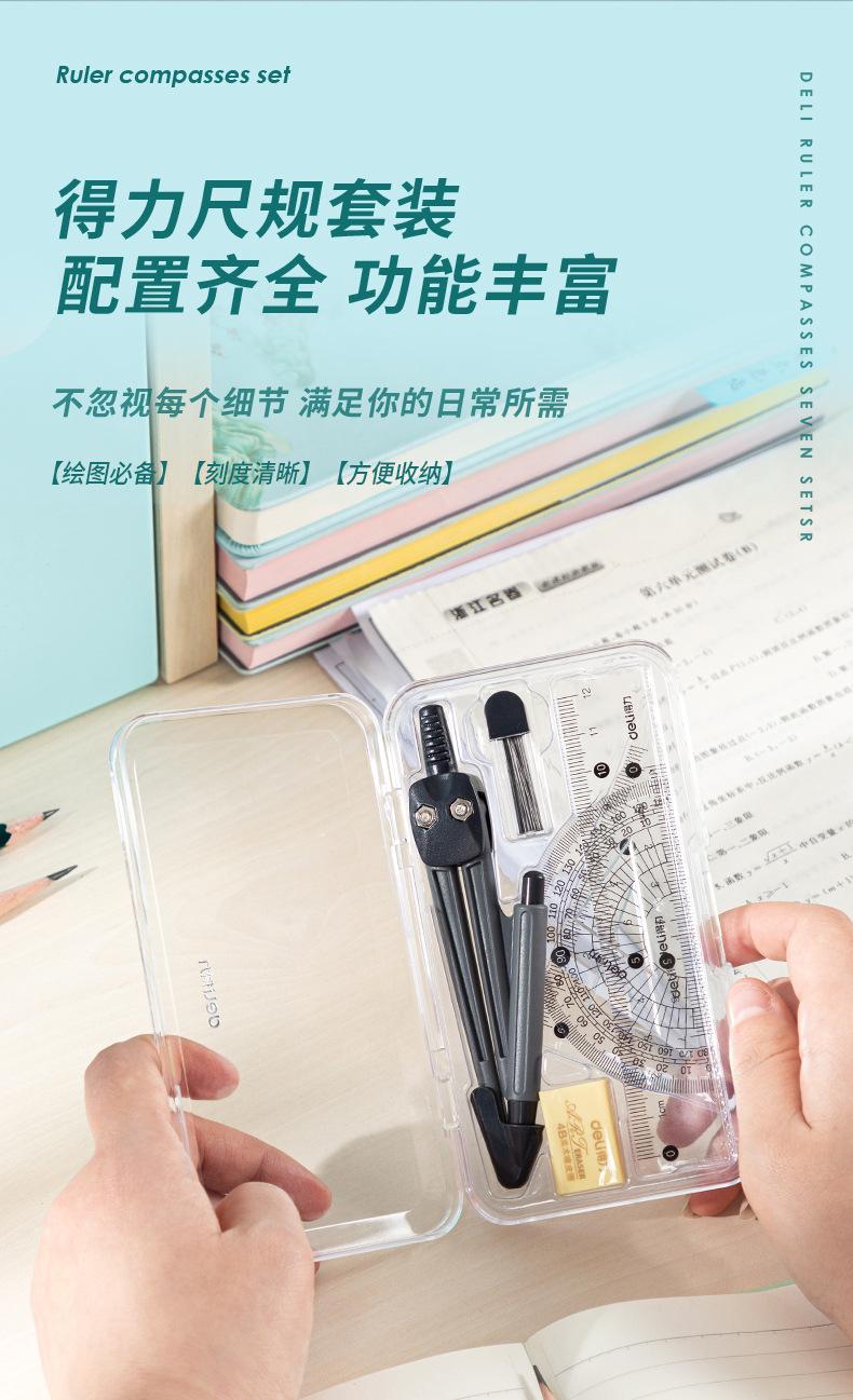 Juego de reglas Deli 79524 para estudiantes con regla de dibujo para exámenes, regla triangular, transportador y compás en caja, juego de 7 piezas