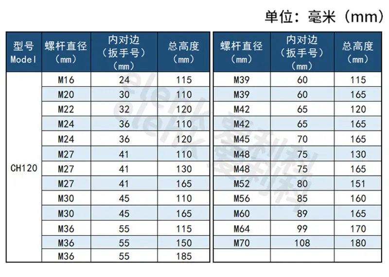 Model * inside side * Total height, M16 * 24*115, M20 * 30*110, M22 * 32*120, M24 * 36*110, M24 * 36*120, M27 ...