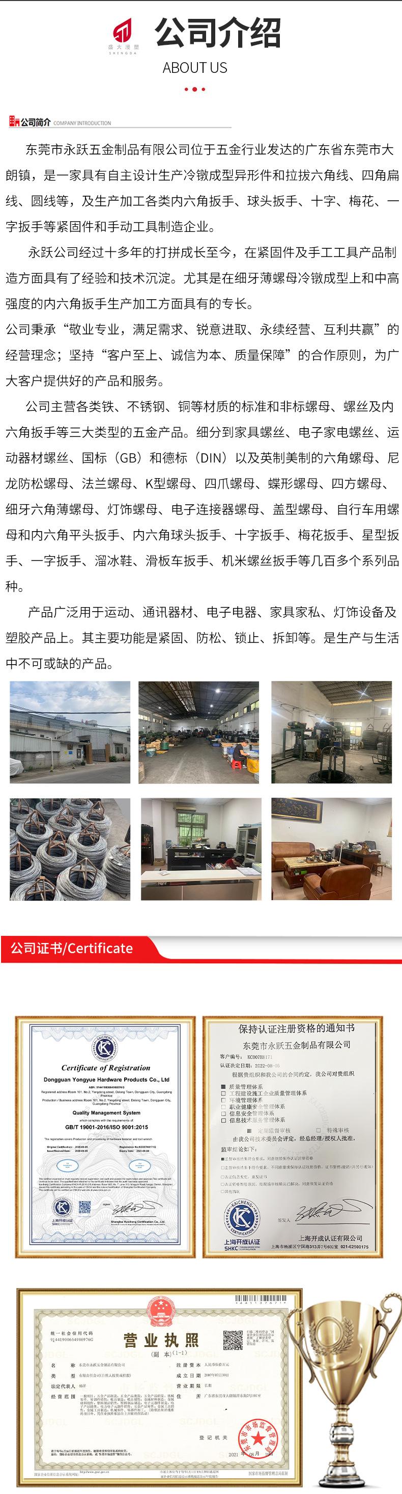 Dongguan Yongyue Hardware Products Co., Ltd. está ubicada en la ciudad de Dalang, ciudad de Dongguan, provincia de Guangdong, donde la industria de ferretería está bien desarrollada. Vende principalmente tuercas estándar y no estándar, tornillos, llaves hexagonales y otros sujetadores y estampados hechos de diversos materiales como hierro y acero inoxidable. Los productos se utilizan ampliamente en deportes, medicina, equipos de comunicación, computadoras, muebles, equipos de iluminación, productos electrónicos y de plástico. Estamos comprometidos a proporcionar a los clientes productos de buena calidad y precios competitivos en el mercado, así como servicios de calidad rápidos y eficaces. La mayor calidad del producto y el mejor servicio al cliente son nuestros objetivos constantes. ¡Damos la más cordial bienvenida a clientes nuevos y antiguos en el país y en el extranjero para discutir la cooperación con nuestra empresa en beneficio mutuo y para un futuro brillante!