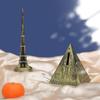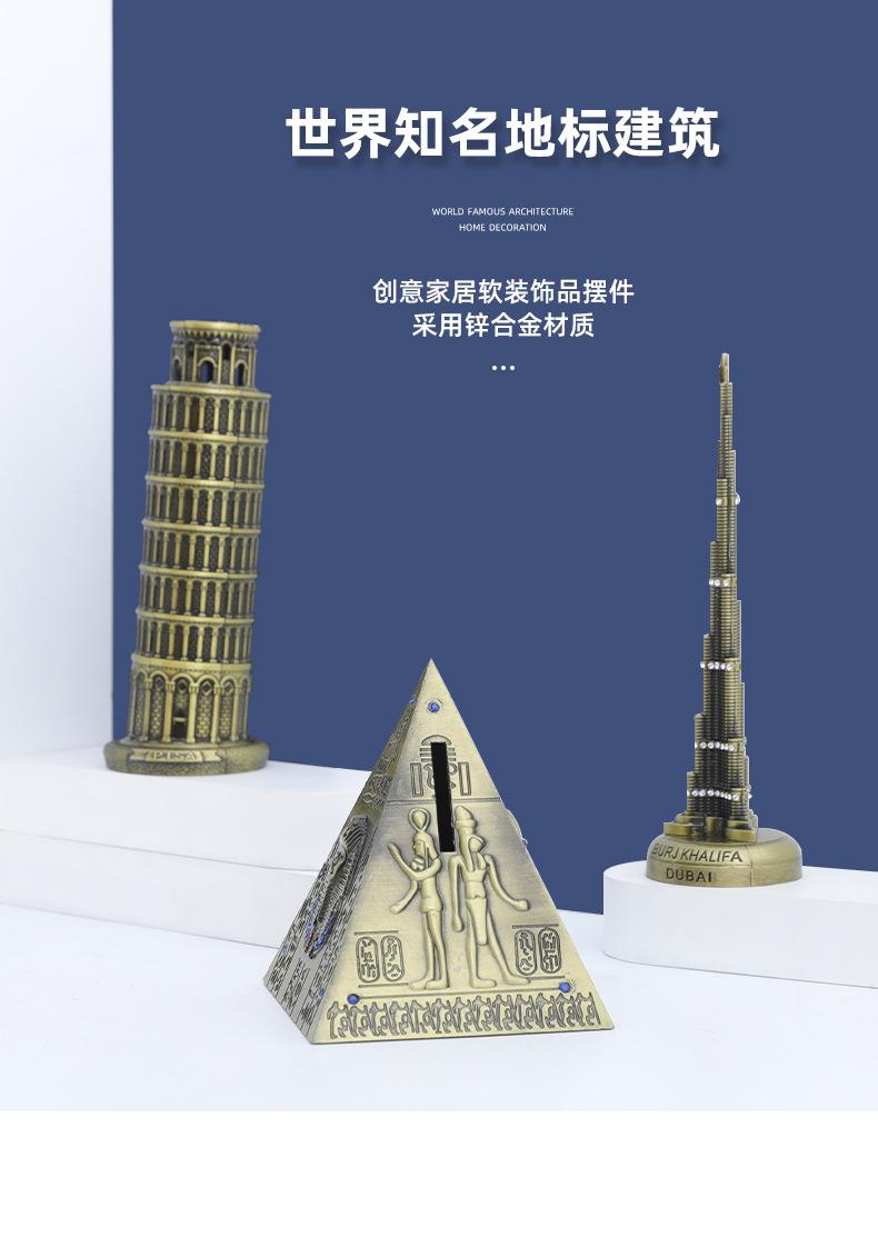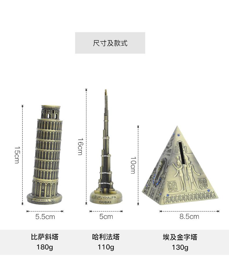 Leaning Tower of Pisa, Burj Khalifa, Pyramid (Piggy Bank), Ferris wheel (trumpet), Big Ben (small without cloc...