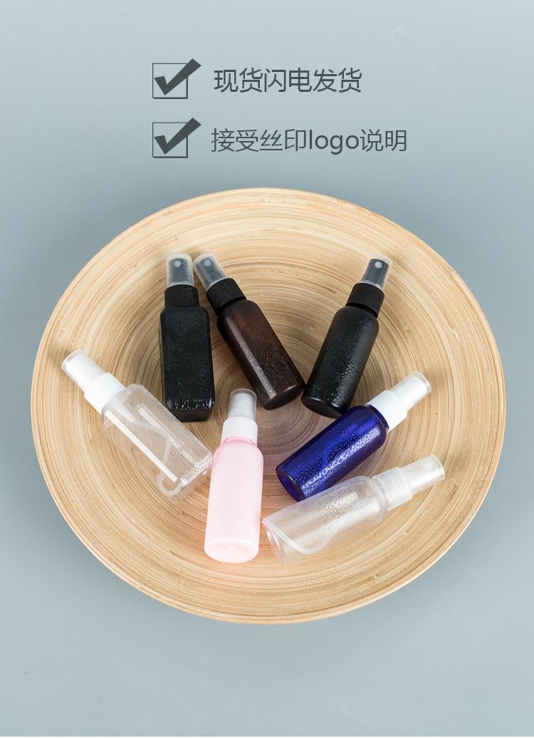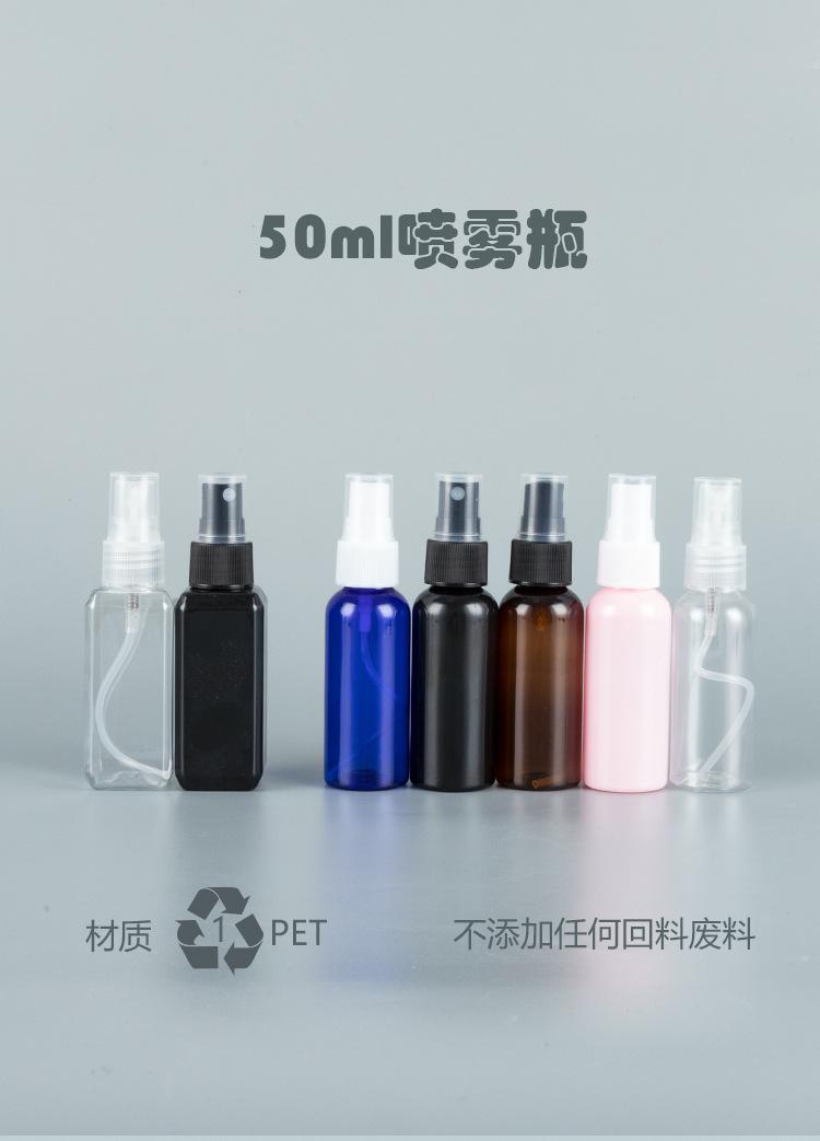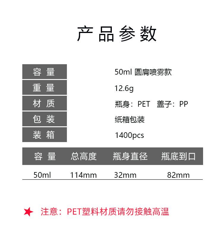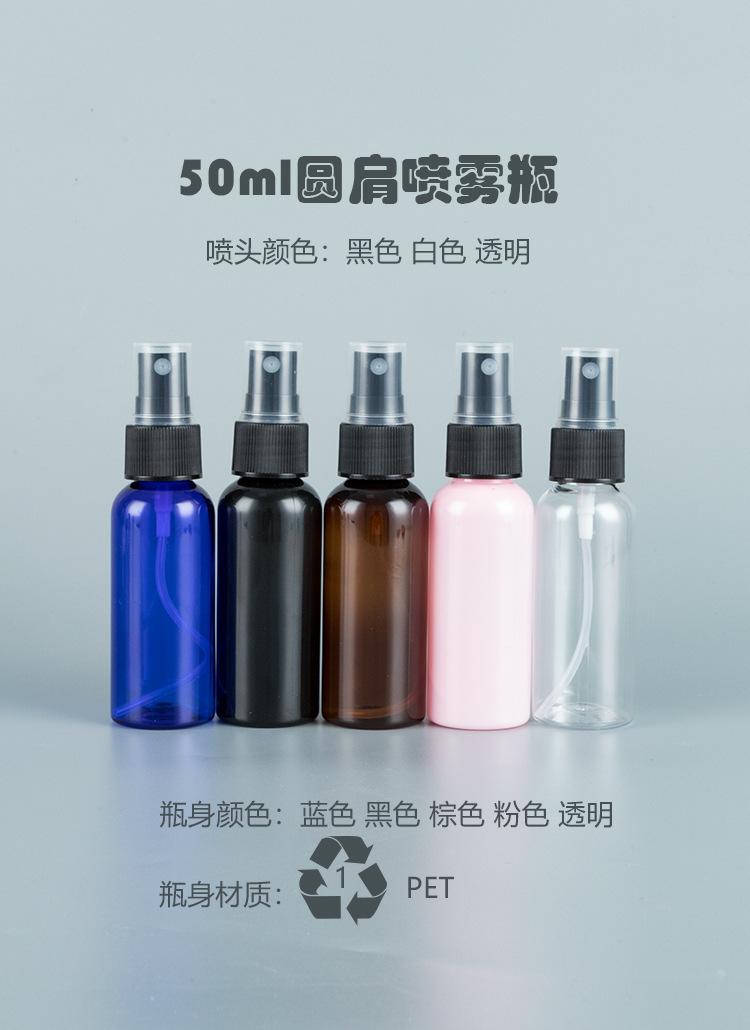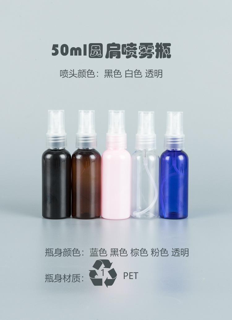 Botella de hombro redonda de 50 ml con cabezal de pulverización de seda acanalada, envase cosmético, agua de desinfección de rocío puro, niebla fina, botella vacía de PET dividida